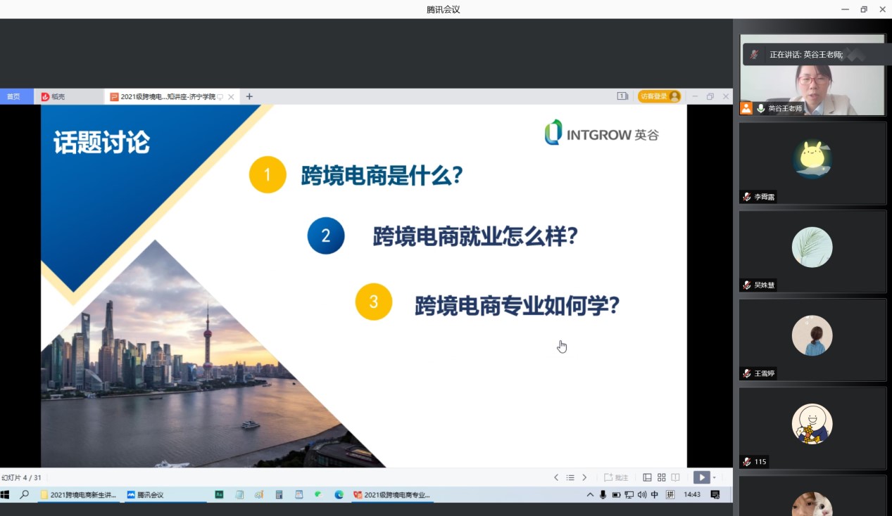 为使2021级商务英语专业新生对自己的专业有更好的了解,做好学习规划,10月29日下午,安博站官网登录入口联合校企合作单位青岛英谷教育科技股份有限公司通过腾讯会议举办了商务英语(跨境电子商务方向)专业认知讲座。讲座由青岛英谷教育科技股份有限公司的跨境电商讲师、项目经理王树叶主讲。安博站官网登录入口商务英语教研室主任李霄露、商务英语专业任课教师、2021级商务英语专业学生参加了线上讲座。