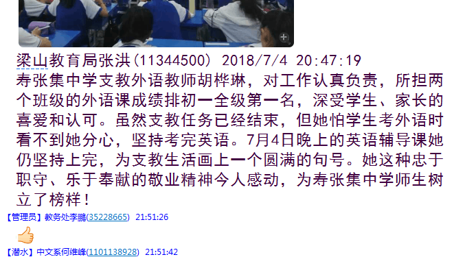 在支教过程中,外国语系从思想、组织、纪律、人文等层面开展详细、合理、高效的实习支教工作,支教学生不怕苦、不怕累,爱岗敬业,以高度的责任感顺利完成了历届支教任务。支教生展现的良好英语专业技能和个人素养、我校的高尚、坚强的精神风貌受到支教单位师生的一致好评。2015级本科师范支教生胡桦琳“忠于职守,乐于奉献的敬业精神”获得支教学校一致好评,受到梁山县教育局领导的高度赞扬。2016级英语教育支教生王娇娇则积极参与“繁星教育”课题研究,讲奉献、敢担当,主动承担了大量工作,取得优异成绩,被评为“优秀教师”。在今后的工作中,外国语系将继续认真执行学校实习支教工作方案,更高效地完成实习支教工作,提高我系师范生的英语专业素养和专业技能,为社会培养更合格的英语专业教师和优秀人才。