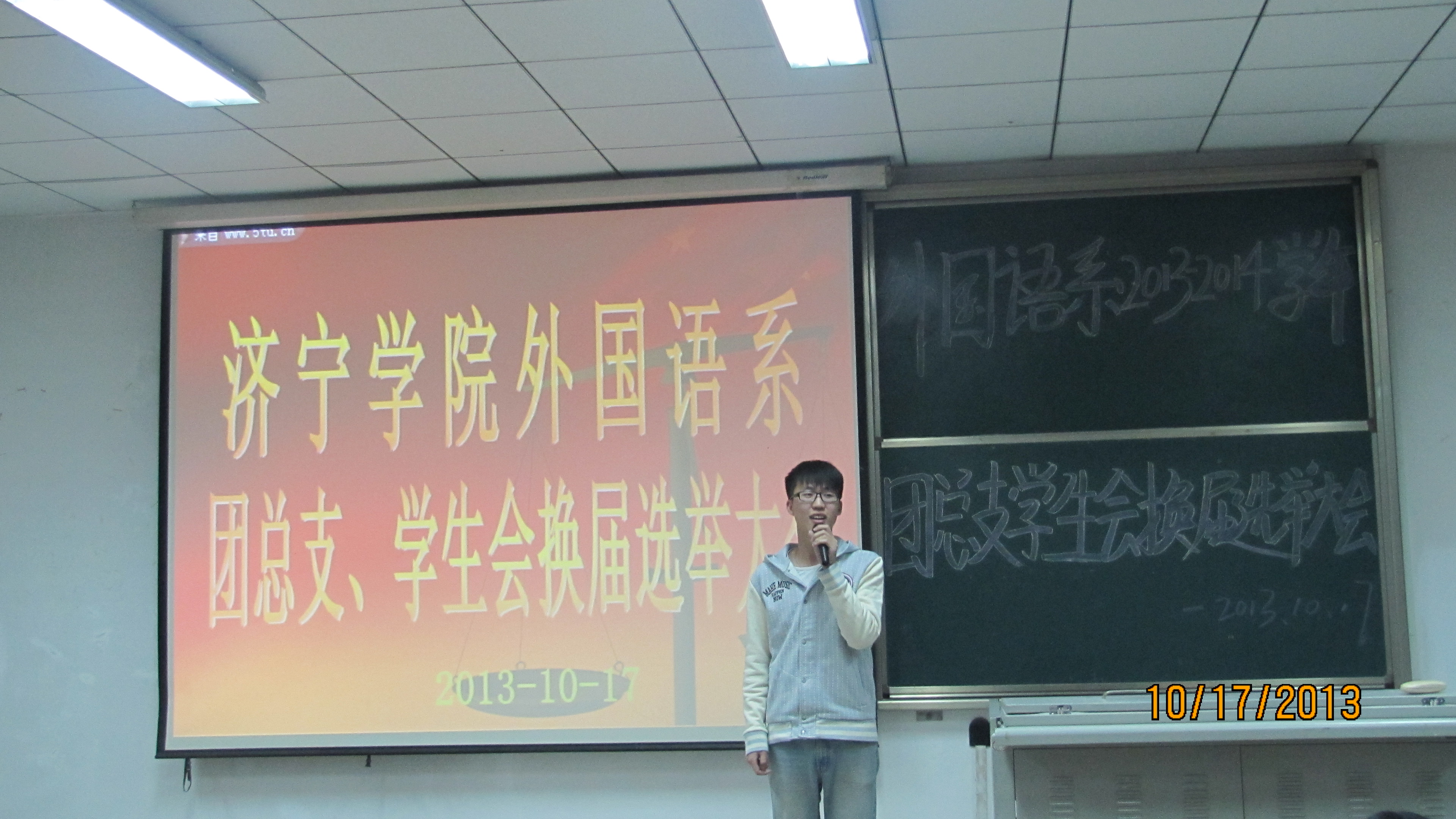 10月17号晚7:00,外国语系在(C201)室开召开了外国语系团总支、学生会换届选举大会。40多名竞选代表和原团总支、学生会学生干部及各年级各班学生代表共计160余人参加了会议。外国语系党总支书记王军、团总支书记徐俊凯也出席了会议。
