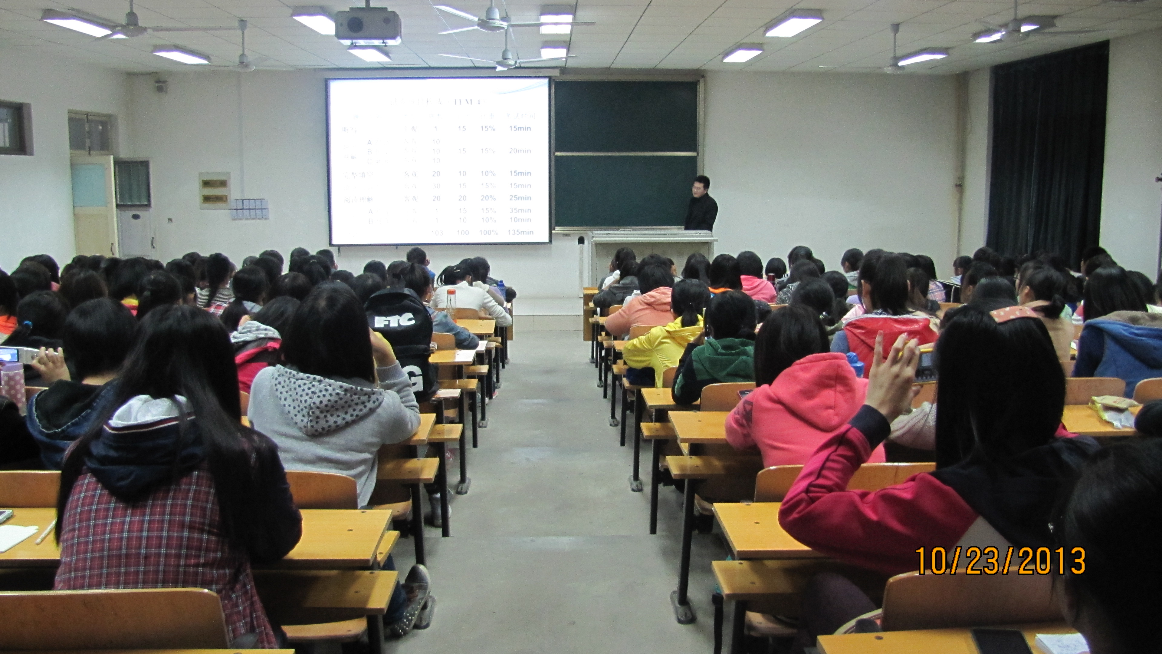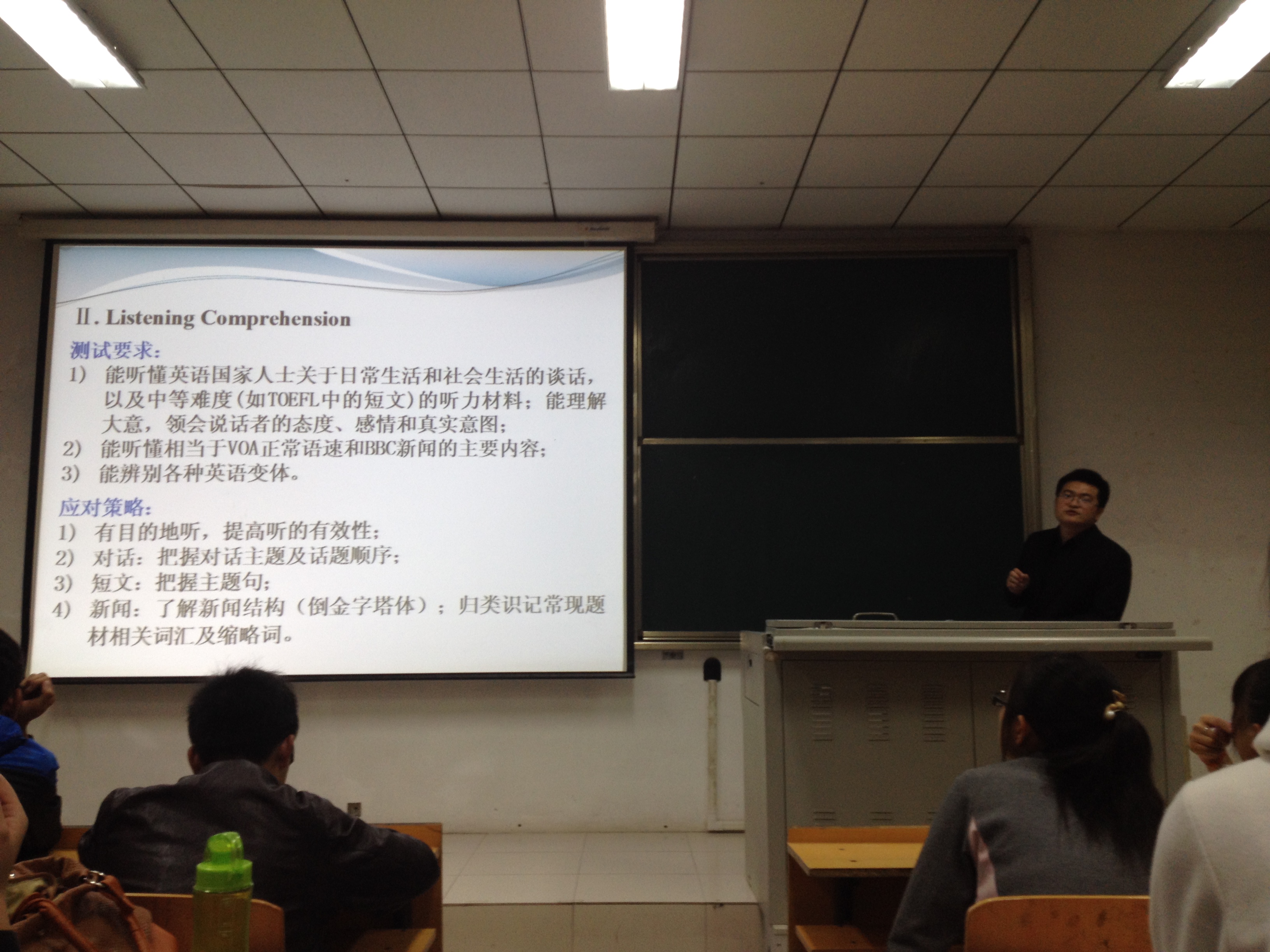 肖冠华老师首先就英语专业四、八级考试目的与要求作了介绍,接着,他针对近年我系学生在英语专业四八级考试中出现的问题及考试题型作了具体的分析,并提出应对策略。肖老师还为同学们提供了许多相关备考资料及资源,他希望同学们要在备考中不断提高自身基本语言技能、打好专业基础,不断提升自身文化素养。