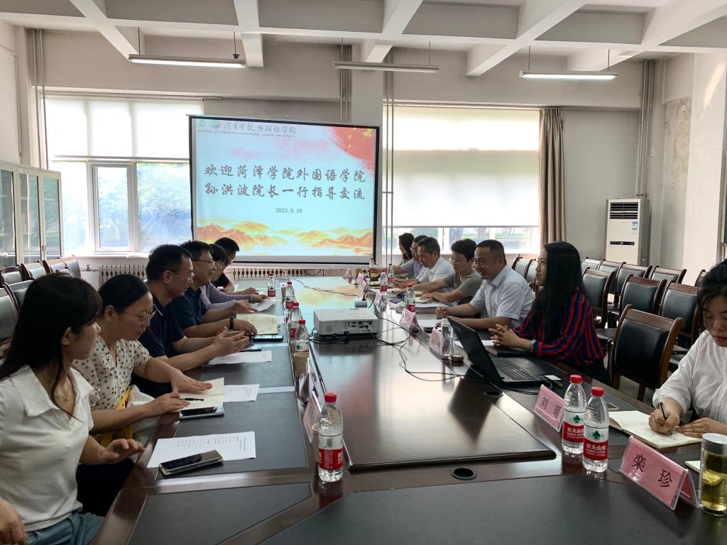 座谈会上,陆波对孙洪波一行的到来表示热烈欢迎,简要介绍了外院的总体情况,期待双方能进一步加强合作联系,共同促进各项事业的发展。张颖介绍了英语专业的发展历程、专业设置、人才培养等方面的情况,重点介绍了师范专业认证的准备过程和专家进校现场考查的注意事项。孙洪波介绍了菏泽学院外院学科专业建设、师资队伍和专业认证准备工作,希望双方开展深度合作与交流。随后,闫彩霞、栾珍、吴瑞民、刘春雷和张玉姗分别介绍了实习实践基地、材料抽调、学生技能训练、教师授课、校友和用人单位联系以及联络员工作的准备和实施过程,并对菏泽学院外院工作组成员提出的问题进行详细解答。