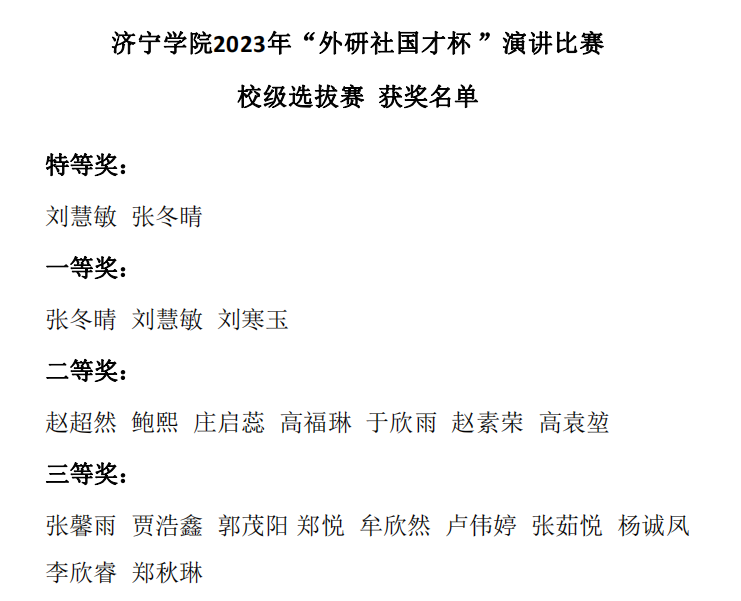 本次比赛为同学们提供了展示自我的平台,掀起了我院学生学习英语的高潮,在一定程度上提高了同学们的英语演讲能力,对我院学生英语水平的提高起到了有力的推动作用。