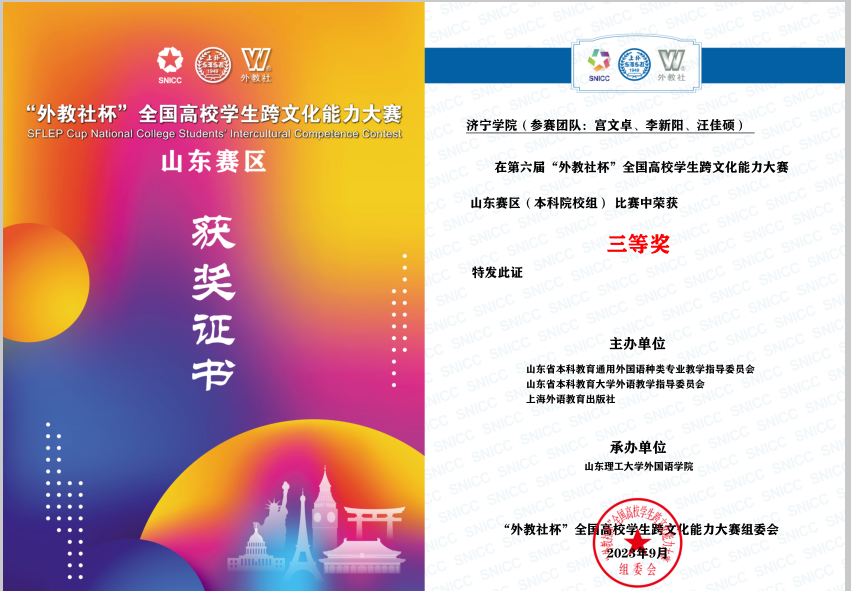 近日,第六届“外教社杯”全国高校学生跨文化能力大赛(本科院校组)山东赛区复赛和决赛在山东理工大学举办。安博站官网登录入口宫文卓、汪佳硕、李新阳三位同学获得山东赛区三等奖。