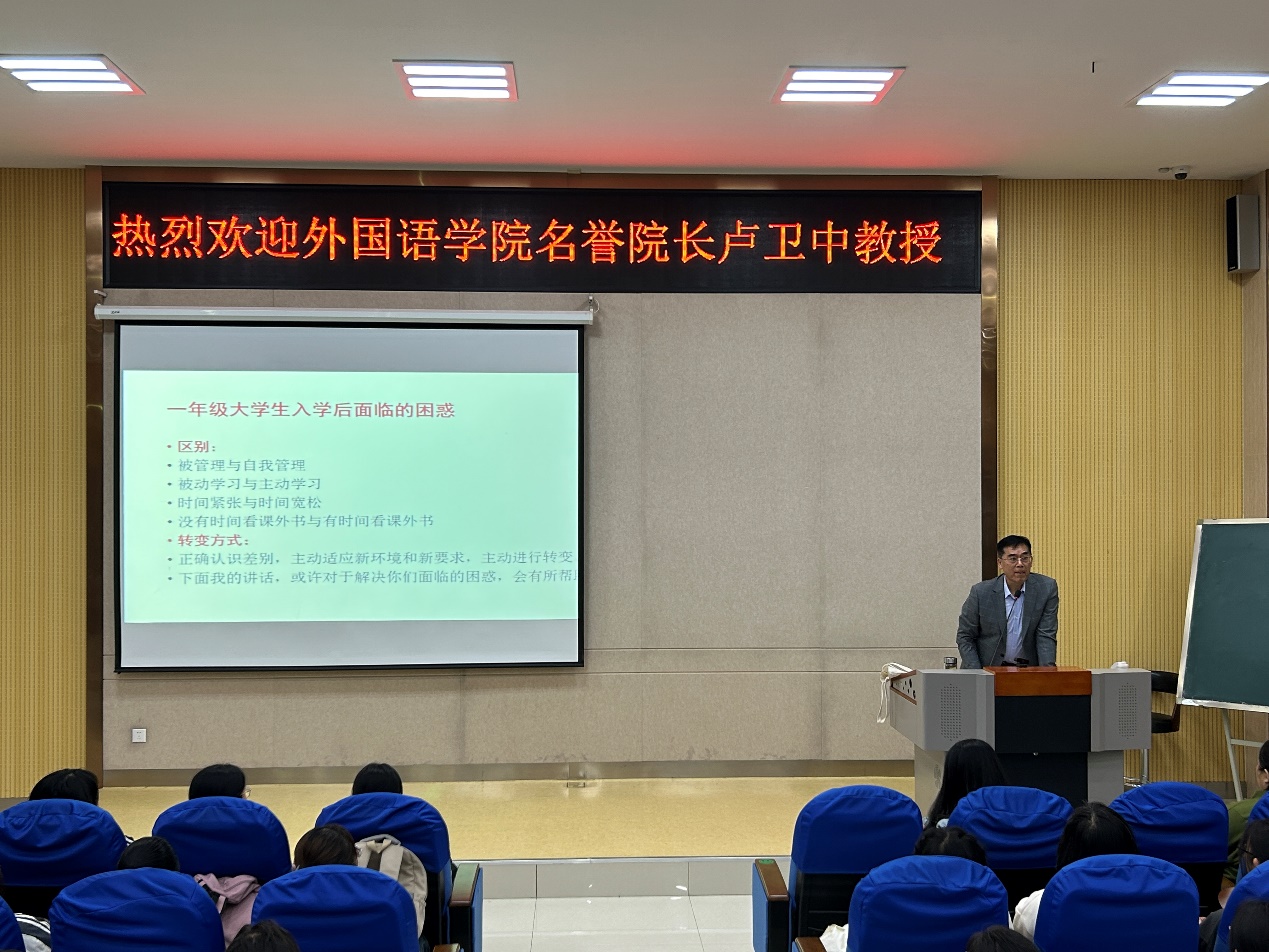 10月26日晚,安博站官网登录入口名誉院长卢卫中教授在9号楼D101做了题为“致2023级外语新生——争做新时代的优秀外语人”的报告。报告由安博站官网登录入口副院长张颖主持,辅导员老师及2023级全体新生参加本次活动。