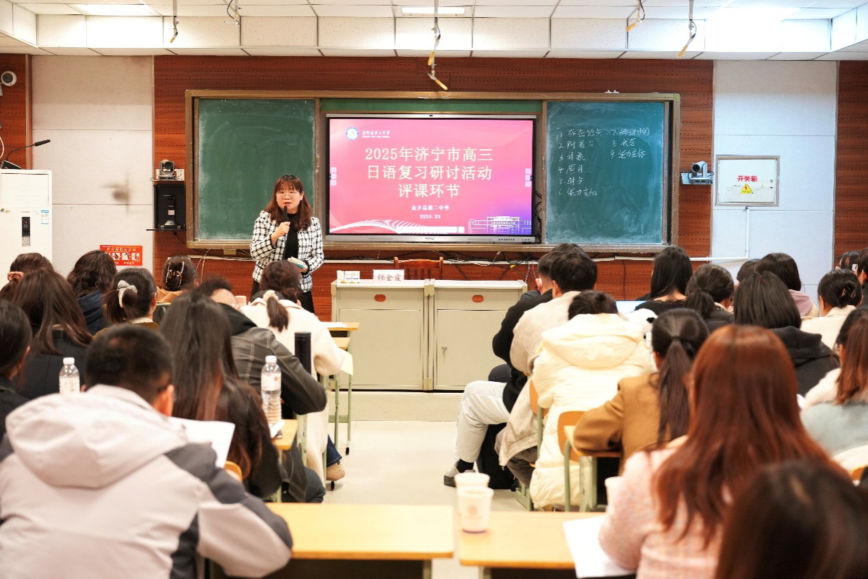 活动中,来自金乡一中、二中的两位日语教师分别进行了课堂展示,内容涵盖基础语法讲解和完形填空解题技巧。张金霞对两位教师的课程进行了细致点评,并结合自身课题研究成果,就教学组织优化、学案撰写规范以及如何发挥外语人文性等方面提出了建设性建议。她强调,高中日语教学在夯实学生基础知识和提升语言能力的同时,应通过多样化的教学手段和互动形式,充分调动学生参与课堂的积极性,真正实现“以学生为中心”的教学理念,助力学生的全面发展。