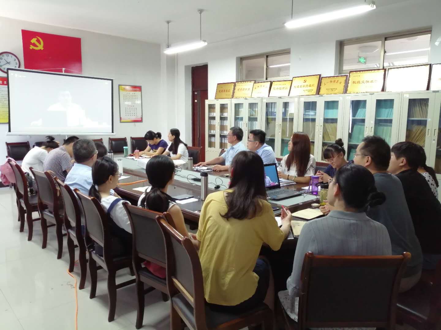 为深入学习贯彻《中国共产党党员教育管理工作条例》,结合开展“不忘初心、牢记使命”主题教育,2019年7月1日上午,外国语系组织全体党员在会议室收看了“灯塔大课堂”第一课,庆祝中国共产党成立98周年。