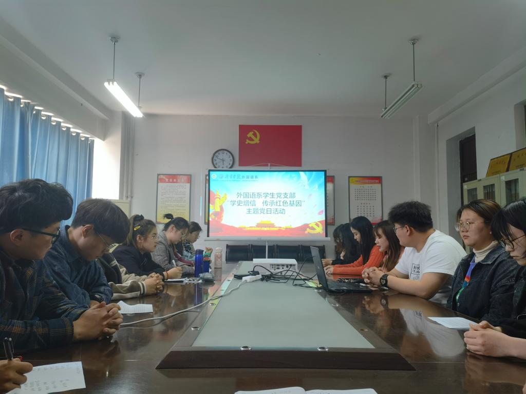 4月14日下午,外国语系学生党支部在三楼会议室举办“学史增信 传承红色基因”主题党日活动,全体党员参加。
