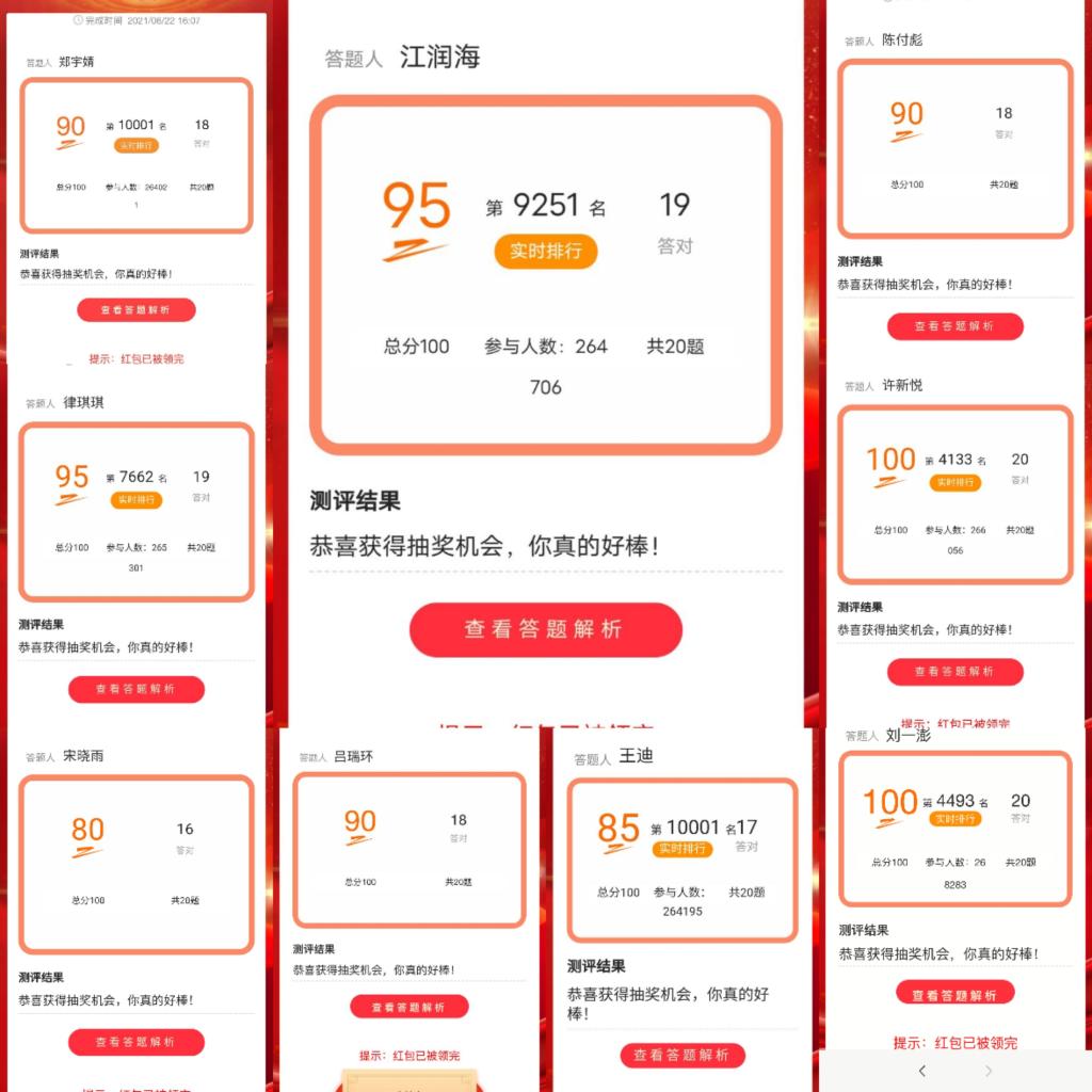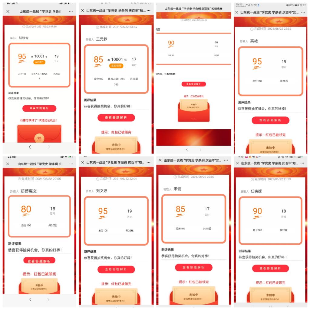为庆祝中国共产党成立100周年,为更好地学习宣传、贯彻落实《中国共产党统一战线工作条例》,不断提高统一战线工作科学化、规范化、制度化水平,进一步发挥新时期统一战线凝聚人心、汇聚力量的法宝作用,根据省委统战部和学校的工作安排,6月24日-28日,安博站官网登录入口组织全体教职工及学生党员参加了省委统战部在“山东统一战线”微信公众号举办“学党史 学条例 庆百年”知识竞赛活动。为扎实做好《中国共产党统一战线工作条例》学习和竞赛答题活动,确保活动参与率,安博站官网登录入口党委高度重视,精心组织,广泛发动,教工党支部参与率100%,学生党支部参与率100%。