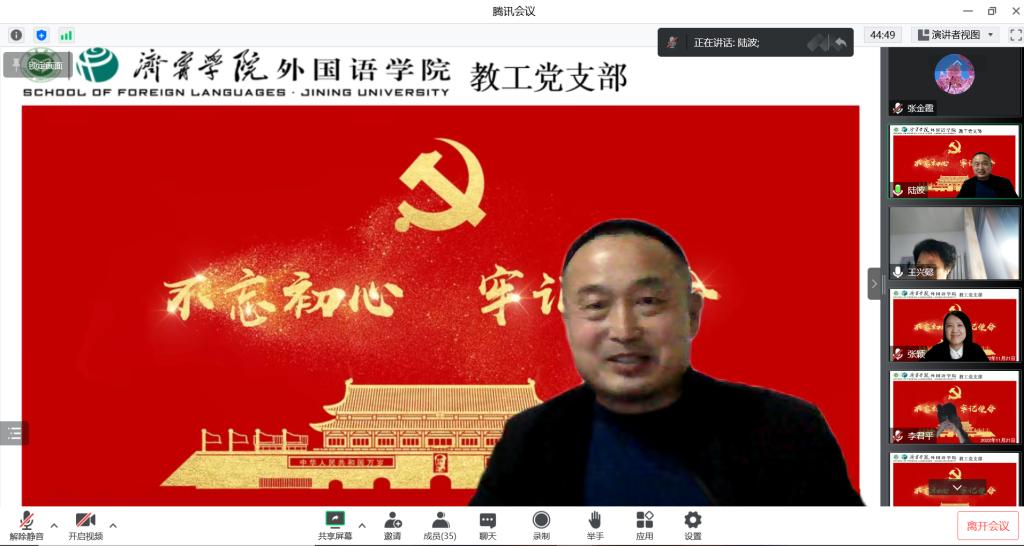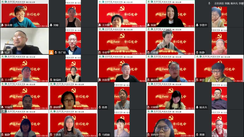 11月21日晚上7:30-8:30,安博站官网登录入口教工党支部在腾讯会议召开了全体党员会议,举办“书记讲党课”、重温入党誓词活动。安博站官网登录入口党委书记陆波、党委副书记许言强、教工党支部书记张颖及全体教工党员参加了学习交流会,会议由教工党支部书记张颖主持。