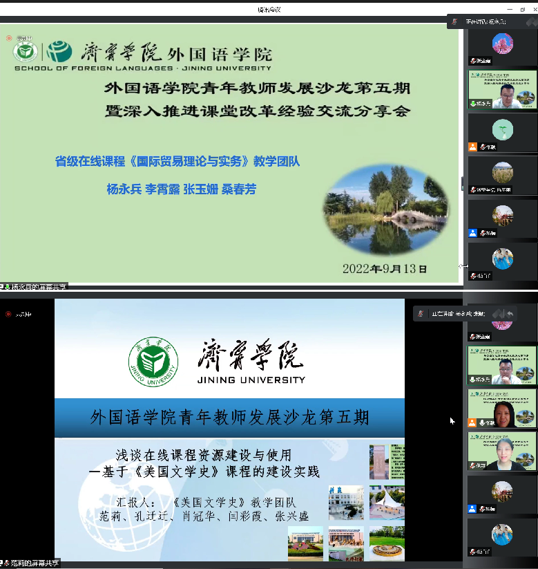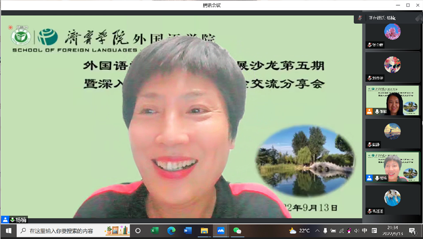 接下来,杨永兵、范莉、张金霞、戴静四位教师分别从山东省联盟在线课程建设、开展线下课堂改革、线上课程无缝对接线下教学等方面进行了精彩的分享。杨永兵老师从“态度决定一切”、“思考课程之锚”、“精心备选资料”、“拍摄注意事项”四个方面回顾了《国际贸易理论与实务》课程的心路历程。他提到,每位教师都应该围绕课堂改革,学生的技能、素养培养和课程影响力提升多琢磨、多思考,不断加强团队合作。范莉老师从“Why、What、How、Summary”四个角度深入浅出分享了省联盟在线课程建设的缘由、内容、途径和心得。她提到《美国文学史》课程2022年上线国家高等教育智慧教育平台以来,目前有500多名社会学习者选学此课程,既发挥了高校服务社会的优势,又扩大了学校的社会影响力。张金霞老师按照课程录制前、课程录制时、课程录制后的时间主线,梳理了《初级日语》课程的建设新思路。戴静老师以“以德为先,面向人人、知行合一大学英语重点课程建设汇报”为题,通过课程建设的前期探索和具体情况的分析,总结成果,反思不足。她提到课程建设只有进行时没有完成时,是师生共同成长相互成就的过程。随后,全体教师在线上展开了热烈的讨论。