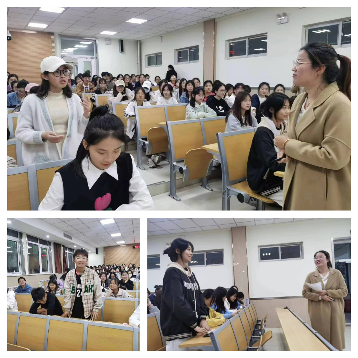 杜冉冉老师用流利而地道的英语介绍作为开场惊艳四座,随后她从“精神站立”和“专业行走”两个方面进行讲解。“精神站立”主要是从“如何成为一名好老师”层面,积极引导学生关注良好的仪表、阳光的心态、尊重、公平、宽容、倾听、伸缩性、博学多才、关注和赞美等十个方面。杜冉冉老师通过身边鲜活的例子,现身说法,讲述了自己如何通过共情方式将一个个顽劣调皮的孩子加以正确引导,将老师的宽容、倾听、关注和赞美体现的淋漓尽致,让在场的学生也仿佛置身于中学校园,体验到和不同类型学生的相处之道,同学们们反响热烈并积极参与互动。