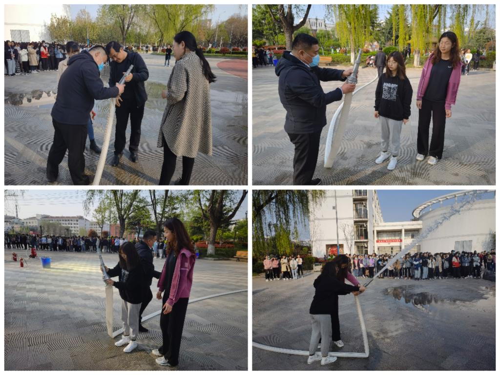 活动中,安全保卫处工作人员讲解并演练了干粉灭火器的使用和消防水带、水枪的安装连接。演示完毕后,老师和同学们进行了灭火器和消防水枪的使用演练。