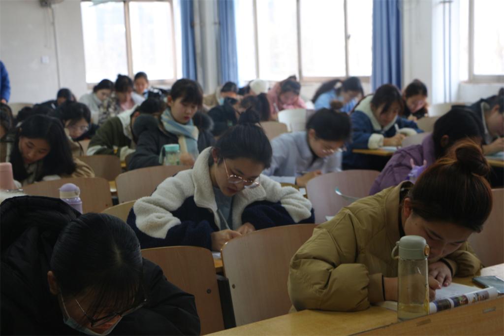 钢笔字组选手分成两组分别在两个教室里进行书写,结束后将作品上交,由评委评分。同学们沉着运笔、一丝不苟,作品笔画流畅、结构匀称、整齐美观,展现了师范专业规范的书写技术。