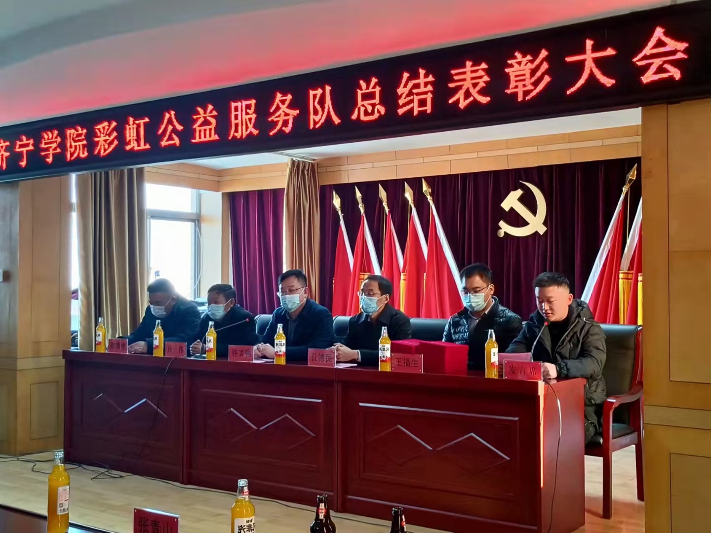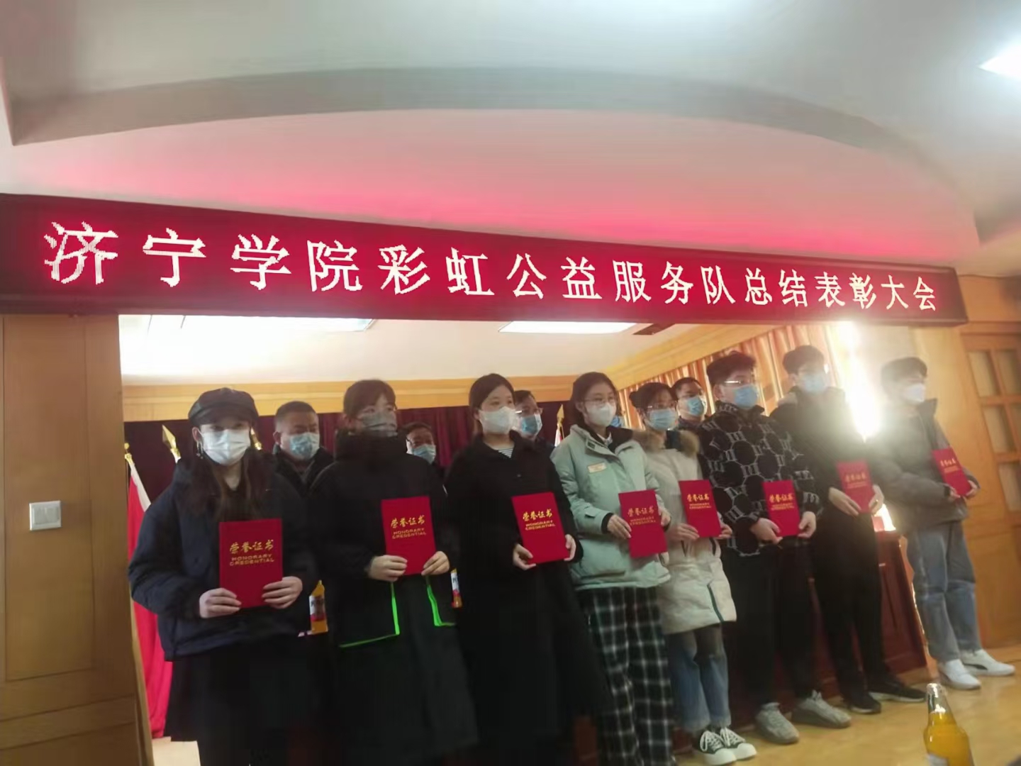 济宁学院彩虹公益服务队队长黄玉秀做2021年度工作总结。济宁学院彩虹公益服务队联合曲阜市彩虹公益服务中心,开展“希望小屋”关爱儿童志愿服务项目,入户回访60余次,开展线上云辅导80余次,送希望书包、爱心大礼包、呵护包、温暖包等爱心物资6万余元。结合学党史为群众办实事活动,走进曲阜12个镇街村居学校开展党史教育宣讲和爱心英语角、珍爱生命防溺水安全教育50次,受益人群达到1万人次。开展“致敬老兵,我与党旗合个影”公益摄影活动,为抗战老兵和退伍军人开展理发,读报、整理家务,包水饺等“七个一”活动。济宁学院彩虹公益服务队始终坚定不移听党话,跟党走,保持正确的政治方向、凝聚社会爱心力量,以更高水平服务社会、服务群众,为乡村振兴和新时代文明实践贡献爱心力量。
