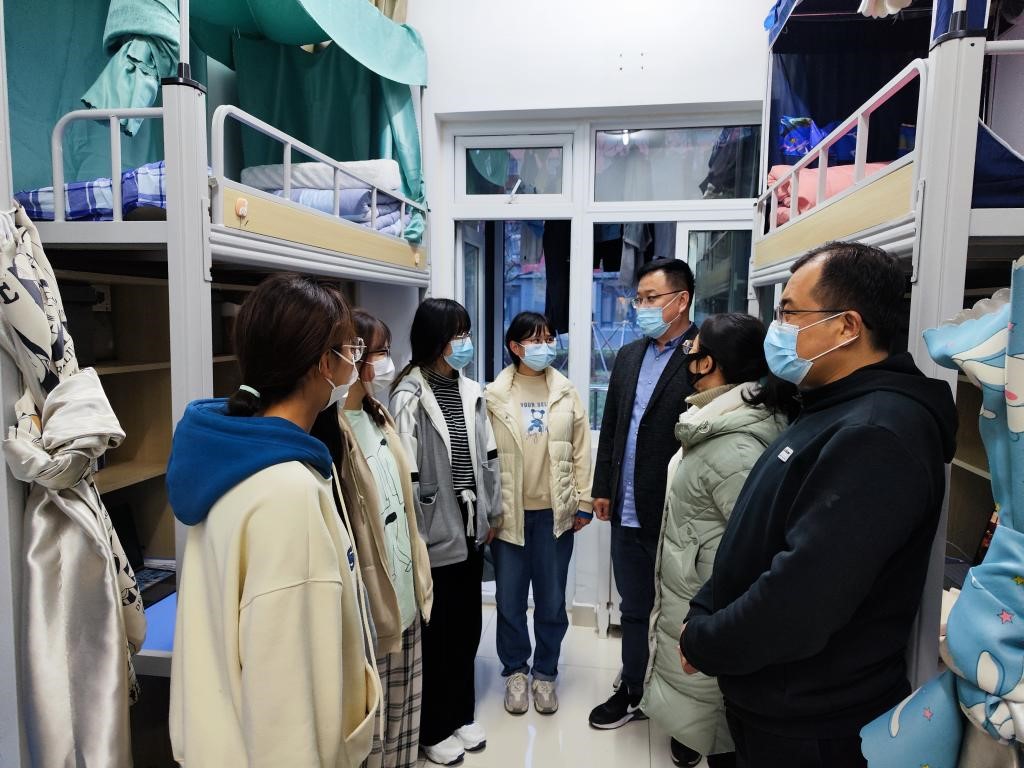 每到一间宿舍老师都和同学们亲切交流,聆听同学们的心声,仔细询问了学生上课效果、生活状况,了解学习生活中的困难,勉励同学们要克服疫情防控工作带来的不便,主动学习、珍惜时光,科学制定作息计划,养成良好的卫生和生活习惯,叮嘱同学们要严格遵守疫情防控期间校园各项管理规定,做好体温“一日三检”、“日报告”、“零报告”等日常管理工作,不点外卖,不网购,积极配合学校做好各项防疫工作。许言强希望学生党员要发挥先锋模范作用,主动作为,甘于奉献,事事处处做表率,彰显党员的责任和担当。