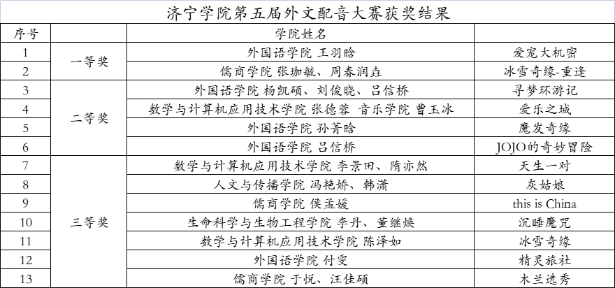 经过角逐,最终,王羽晗配音的《爱宠大机密》,张珈毓、周春润垚配音的《冰雪奇缘:重逢》获得一等奖;杨凯硕、刘俊晓、吕信桥配音的《寻梦环游记》,张德蓉、曹玉冰配音的《爱乐之城》,孙菁晗配音的《魔发奇缘》获得二等奖;其余七组获得三等奖。