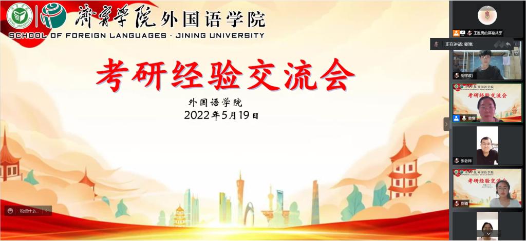 2022届毕业生考研升学工作已落下帷幕,安博站官网登录入口师生共同努力,共有34名同学被爱丁堡大学、北京第二安博站官网登录入口、西安外国语大学、新疆大学等国内外知名院校录取,考研录取率为13.1%。为更好的推进学院学风建设,营造良好的学习氛围,5月19日晚,安博站官网登录入口通过腾讯会议举办考研经验交流会,该院党委副书记许言强,辅导员及2019级、2020级学生参加,交流会由辅导员姜璨主持。