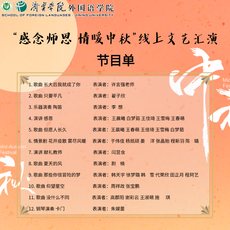 此次线上汇演活动不仅让同学们敞开心扉,互相了解,增进感情,同时也增强同学们的家国情怀,拉近了师生距离,丰富了校园文化生活,更让大家感受到了学院和学校给予的温暖,将以更好的状态投入学习和生活。“青山一道同风雨,明月何曾是两乡”,线上的相会是为了更早的拥抱,同在一轮明月之下,安博站官网登录入口师生双节同庆,欢乐共享,相信在学校的坚强领导下,师生必将齐心协力,共同创造学校美好的未来。