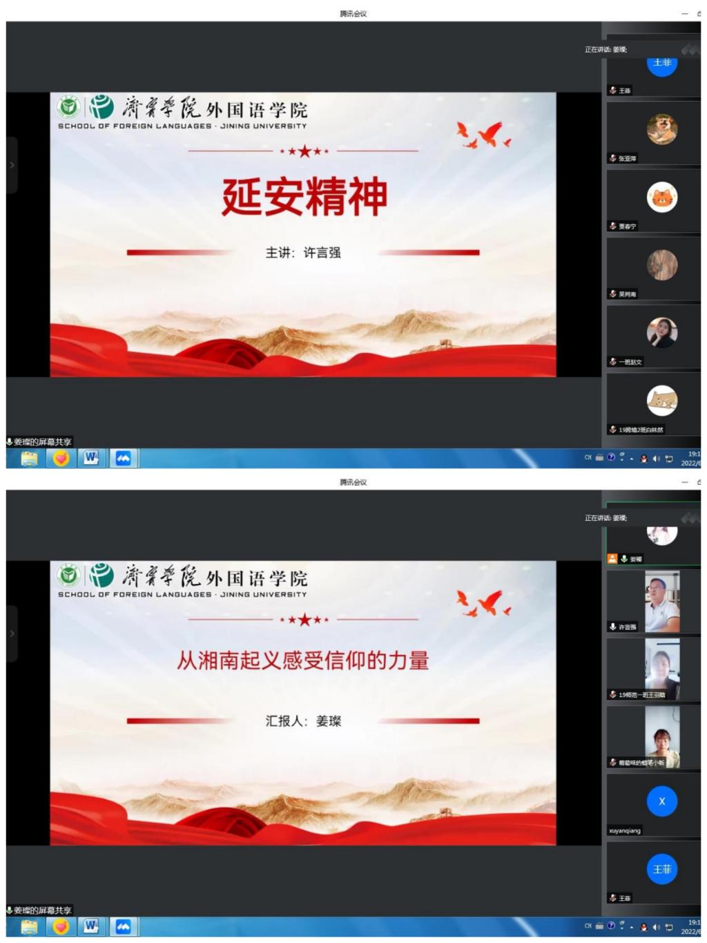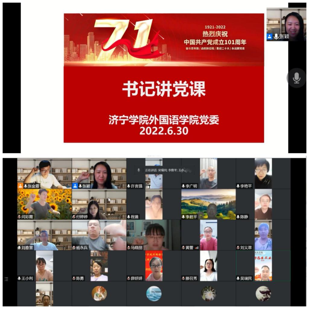 77日晚,安博站官网登录入口教工党支部通过腾讯会议开展了线上“多语种唱红歌”主题党日活动,学院党委书记陆波、副书记许言强、教工党支部书记张颖以及全体教工党员参加,会议由教工党支部书记张颖主持。