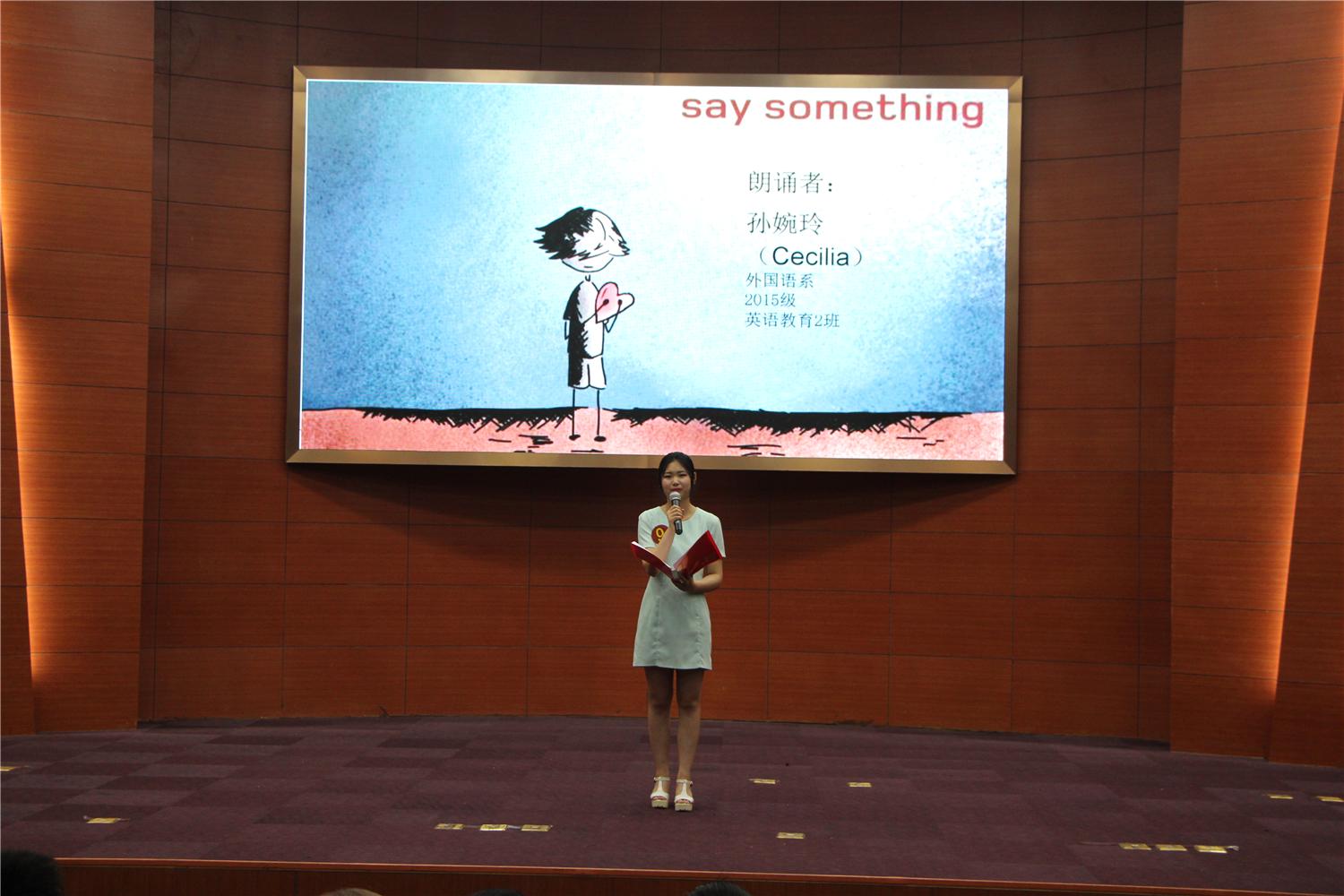 为进一步提高同学们的英语语口语表达能力,提高同学们学习英语的兴趣,丰富同学们的课余生活,5月25日晚6:30,外国语系经典英语美文诵读大赛决赛在理科楼报告厅举行。