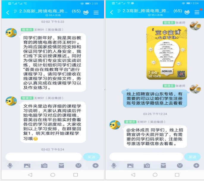 外国语系领导班子多次召开视频会议,认真研讨,多方协调,积极寻求线上实习实训的可行性方案,有针对性地制定疫情期间《外国语系毕业实习学习指导意见》、《外国语系实习支教学习指导意见》等办法,指导师生进行线上实习实训。主动联系校企合作单位—英谷教育科技股份有限公司,沟通疫情防控策略,商讨毕业班跨境电子商务方向学生的实习实训工作,实现校企双方时时在线、实时互动、信息共享、策略共商的运营机制,确保实习实训和就业推荐工作如期开展。