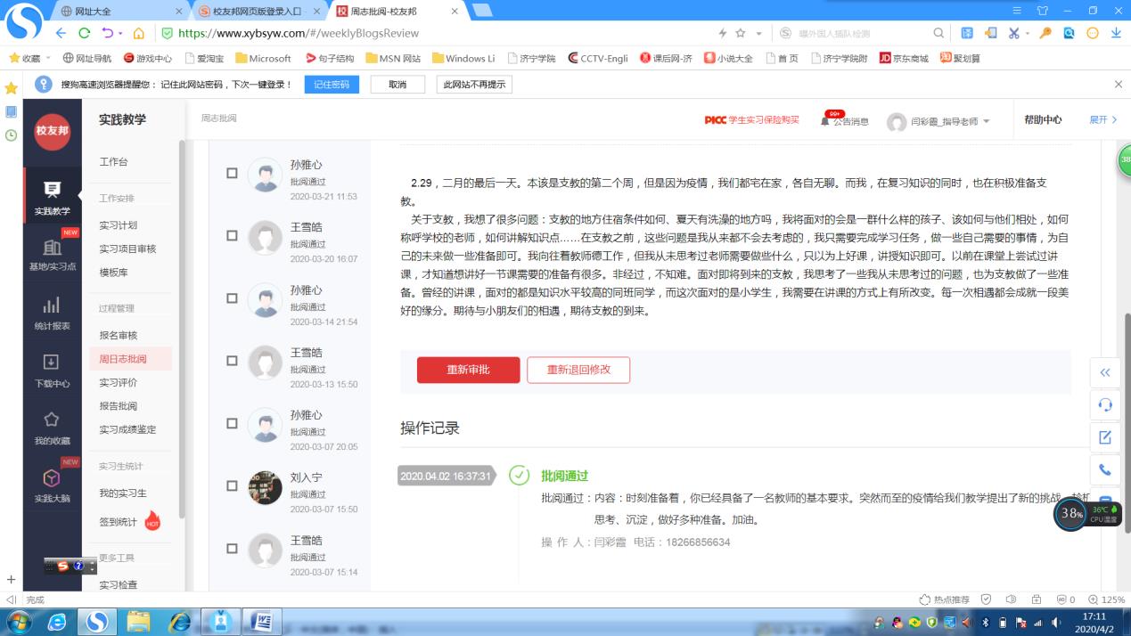全体指导老师认真落实线上学习相关文件要求,严格执行线上实习方案,利用“校友邦”实习软件的签到、周记批改等功能,督促学生每天按时签到,上传周记、学习心得,定期完成实习教案。师范实习生在山东教师教育网“一师一优课”平台和指导老师推荐的其它实习资源网站进行在线观评课等实践活动。师生共用腾讯会议、腾讯课堂、“一师一优课工作坊”、qq群和微信群等网络平台进行在线实习指导交流。