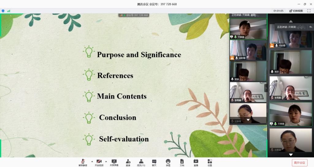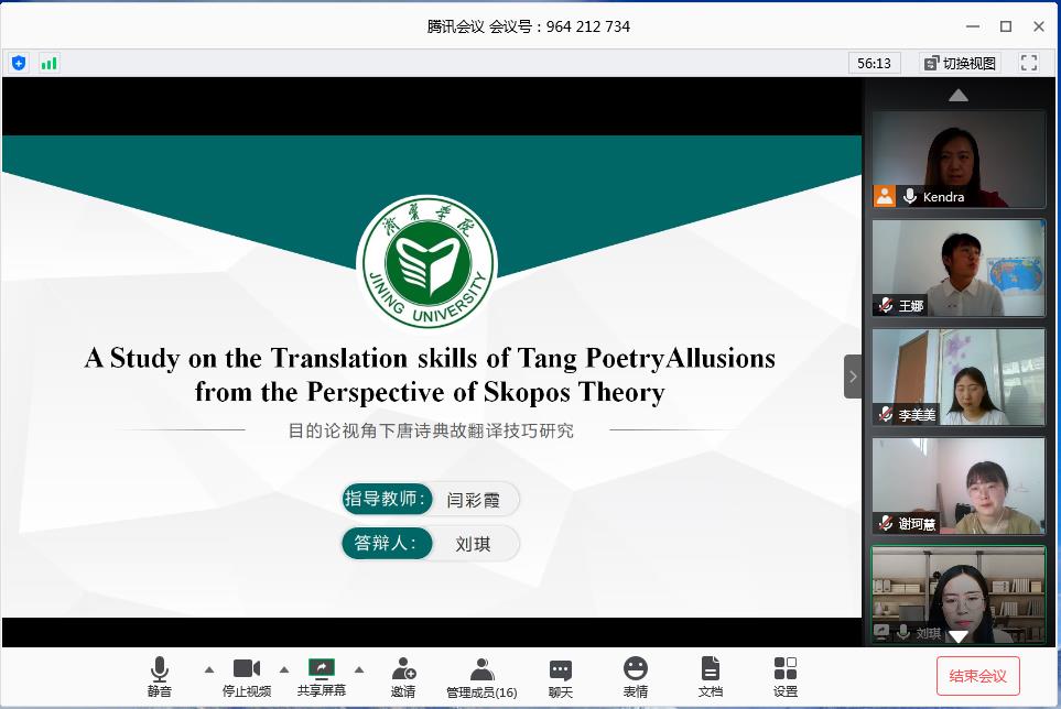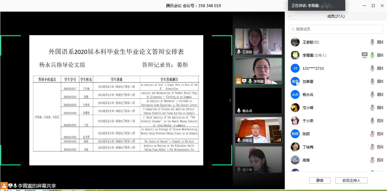 为落实好学校2020届本科生毕业设计(论文)答辩工作部署,确保毕业生能够如期毕业,5月22-25日,外国语系举行2020届英语专业本科毕业生论文线上答辩。此次答辩通过“腾讯会议”平台分13组进行,共有228名学生和29位老师参加。外国语系精心谋划,细致安排,全系上下齐心协力,紧密配合,圆满完成了预期任务。