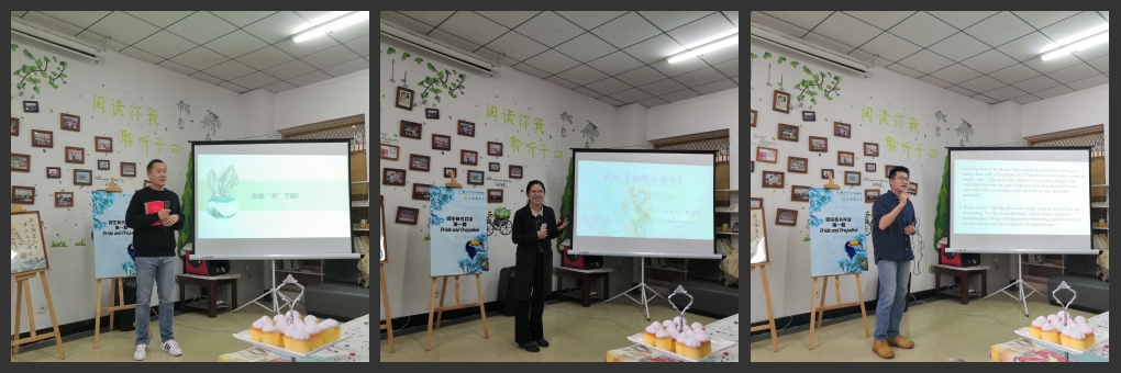 “读书不觉已春深,一寸光阴一寸金。”为回归经典阅读,切实提升英语专业同学的语言技能和人文素养,拓展其知识边界,外国语系以4月23日“世界读书日”为契机,在校图书馆四楼“子悦空间”举办了“师生有书共读”第一期活动。本次读书分享会由系团总支和商务英语教研室共同组织,系党总支副书记许言强、副主任张颖出席,商务英语教研室主任李霄露和教师代表马晓丽、张兴盛、肖冠华老师共同交流了对英国女小说家简·奥斯汀的代表作—《傲慢与偏见》的阅读体会,来自外国语系各专业年级的学生代表参加此次活动。
