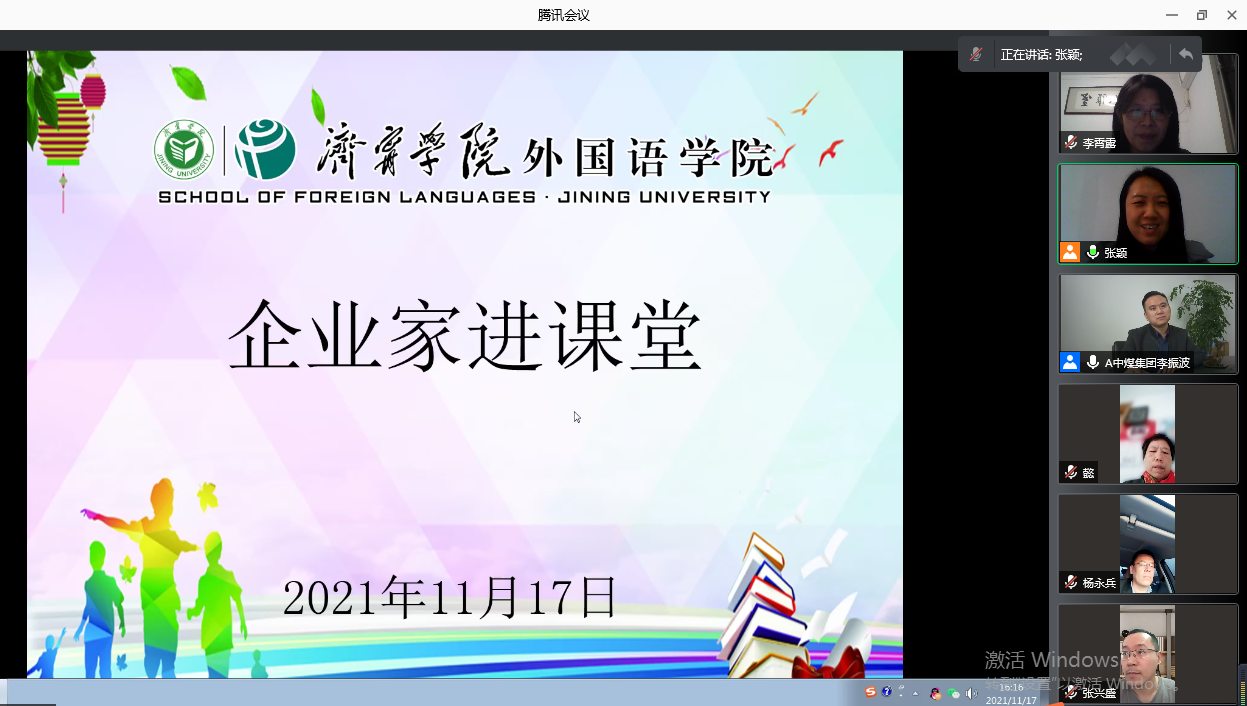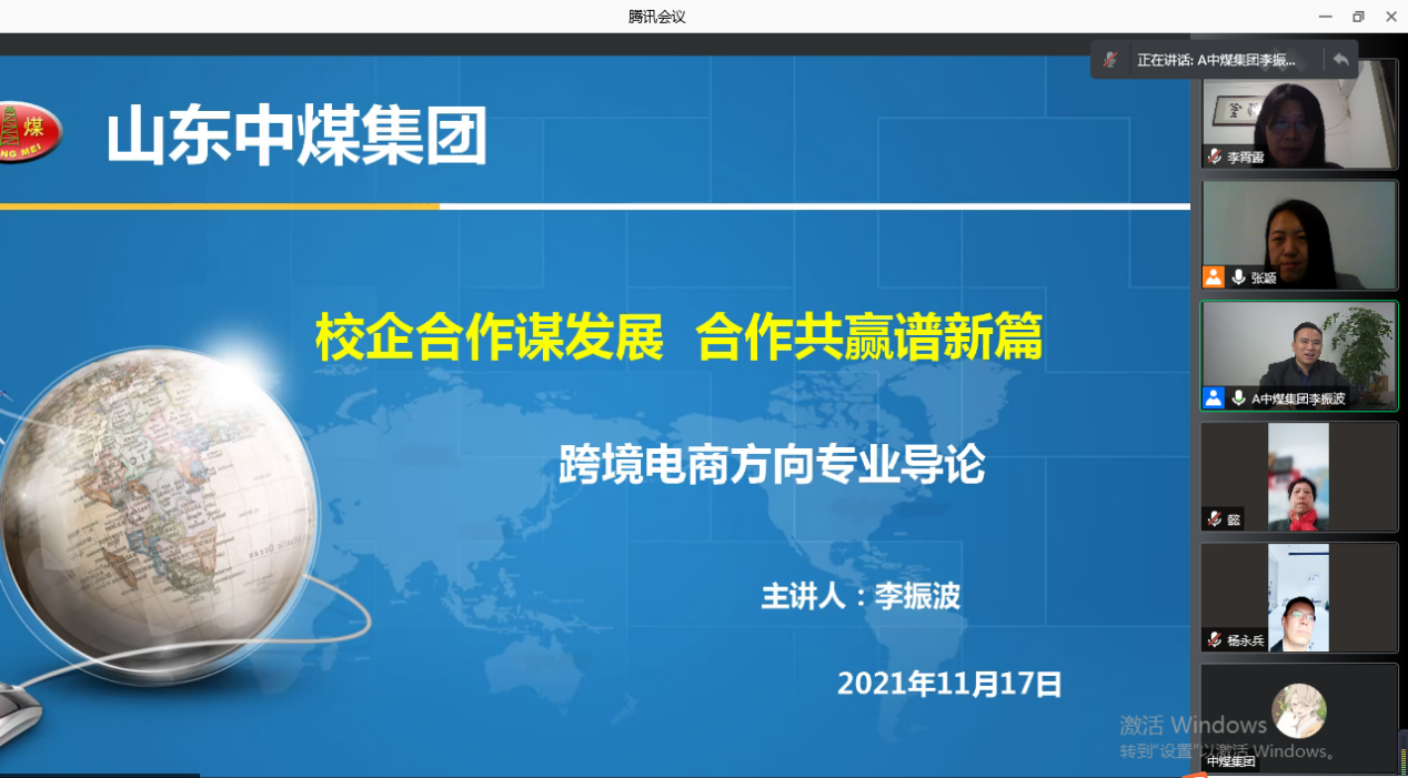 11月17日下午,安博站官网登录入口举行“企业家进课堂”活动,邀请中煤集团常务副总经理兼信息化总经理李振波通过腾讯会议作了题为“校企合作谋发展,合作共赢谱新篇”的讲座。该活动由安博站官网登录入口副院长张颖主持,安博站官网登录入口副院长张殿海、商务英语教研室全体教师以及2019级、2020级、2021级商务英语专业全体学生参加了讲座。