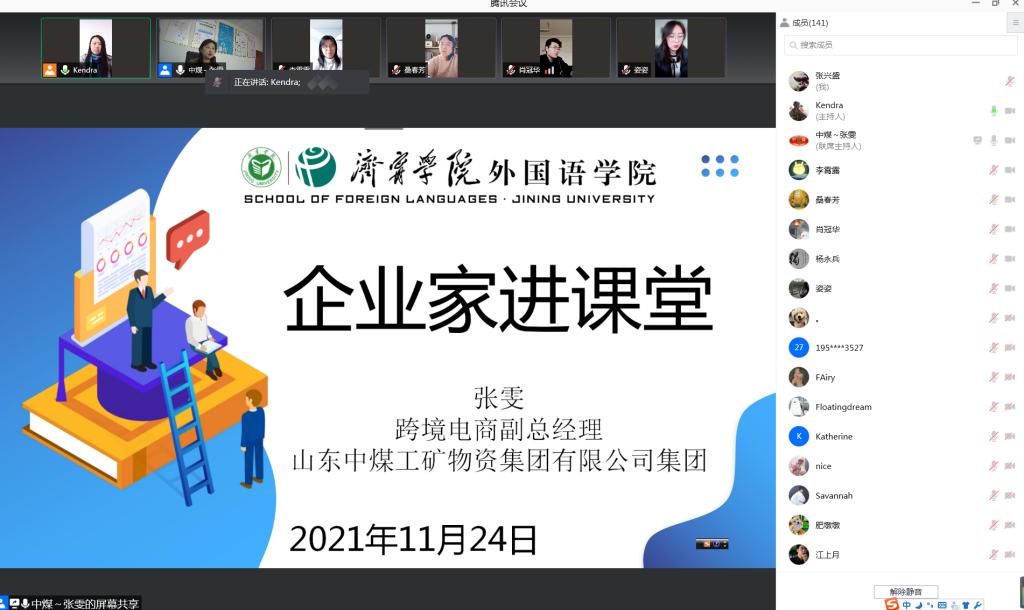 11月24日下午,安博站官网登录入口举办的“企业家进课堂”系列讲座迎来了第二位企业家嘉宾,中煤集团跨境电商副总经理张雯通过腾讯会议为外院师生作了题为“传统贸易与跨境电商的结合”的精彩讲座。安博站官网登录入口副院长张颖主持了本次活动,安博站官网登录入口副院长张殿海、商务英语教研室全体教师以及2019级、2020级、2021级商务英语专业全体学生百余人参加了本次讲座。