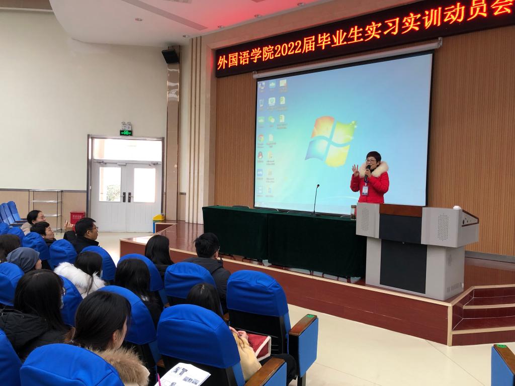 杨楠作实习实训动员讲话。她用爱因斯坦的名言“Try to become not a man of success, but try rather to become a man of value.”启发同学们思考努力奋斗的意义,努力不是为了功成名就,而是为了成为有价值的人,鼓励同学们在学业、实习、就业的道路上继续寻找并展现自己的价值,未来,会因为每一段奋斗的日子熠熠生辉。希望同学们态度要认真严谨,思想要守正创新,学术要诚信规范,在实践中求真知,在实习实训中不断学习,不断进步,充实论文素材,丰富生活阅历,把理论与实践相结合,彰显我院大学生积极向上、自信乐观、不怕吃苦、奋勇争先的青春魅力。