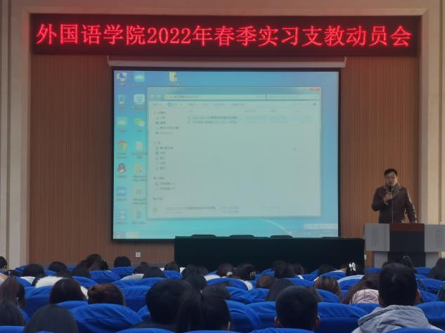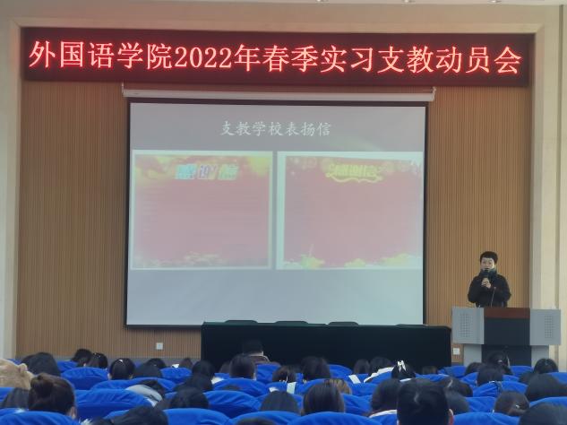 2021年12月30日上午,安博站官网登录入口2022年春季实习支教工作动员大会在3号楼报告厅召开。安博站官网登录入口党委副书记许言强、指导教师代表吴瑞民、闫彩霞、辅导员姜璨出席会议,2019级英语(公费师范)、2021级英语(师范专升本)全体学生参加本次会议。