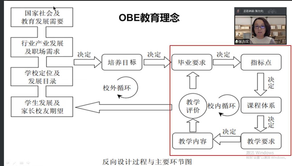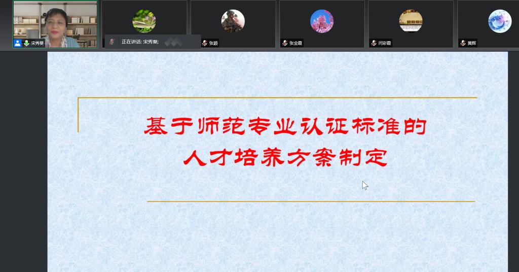 宋秀葵首先介绍了认证专家进校评估考查重点,强调全员参与,把认证理念“内化于心、外化于行”,把人才培养工作做实做深做细。宋秀葵从标准引领、培养目标定位依据、培养目标的内涵分解、培养目标合理性评价及改进建议四个方面分享了基于师范专业认证标准的人才培养方案制定的宝贵经验。然后张力文从整体上介绍了贯穿人才培养全过程的OBE教育理念,阐述了该理念的反向设计过程和正向施工过程,强调了师范认证的意义和对师范认证理念的认同和践行。张力文还具体对毕业要求指标点的制定与分解,二级学院教师如何做好师范认证准备工作这两个方面作了经验分享。