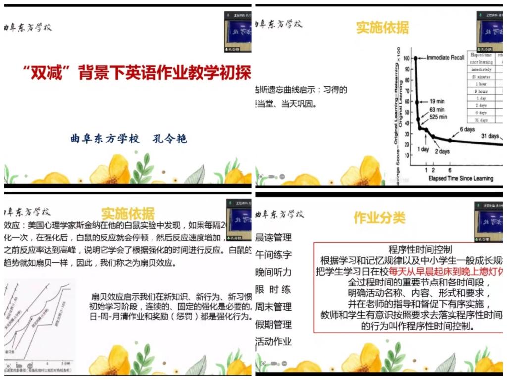 5月27日,曲阜东方学校副校长孔令艳做了“双减”形式下英语学科作业教学探究的讲座。孔校长带领大家学习了有关“双减”的国家政策,展示了东方学校在作业教学中详细具体、扎实有效的做法。我们感受到了东方学校领导和老师们的辛苦付出,领略了东方学校的老师们在英语课堂上展现的“东方文化”和“东方精神”。这场讲座对我们的师范生,尤其是马上就要走上教学工作岗位和实习支教岗位的同学来说是一场及时雨。