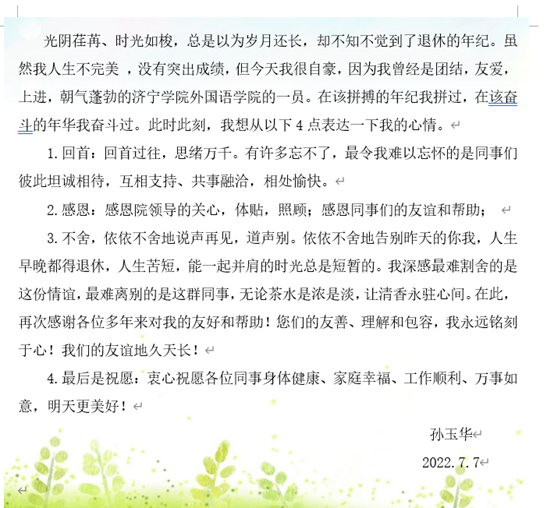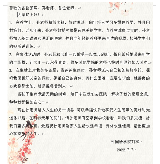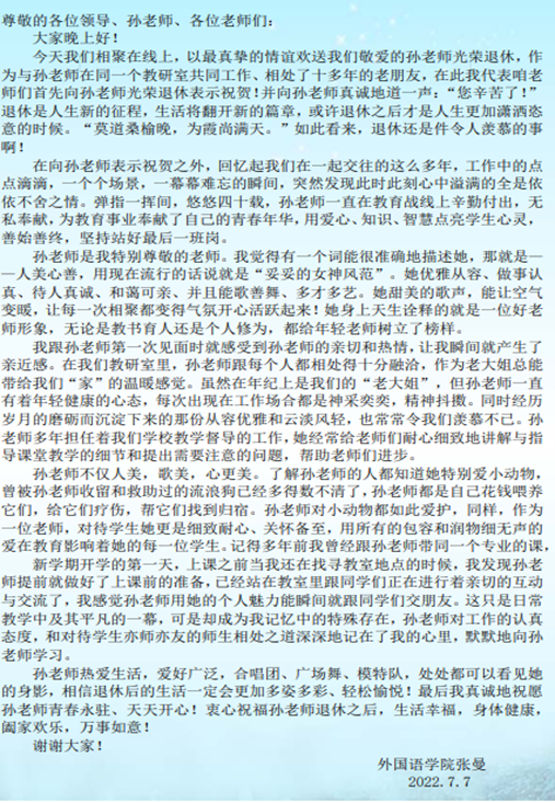 随后,退休教师孙玉华老师用“回首、感恩、不舍”总结自己的教学生涯和退休感受,她说“我深感最难割舍的是这份情谊,最难离别的是这群同事,无论茶水是浓是淡,让清香永驻心间”。随后张曼、刘柳两位教师代表诉说了同孙玉华老师不舍的同事情、亲情。张曼老师说道,孙老师一直在教育战线上辛勤付出,无私奉献,为教育事业奉献了自己的青春年华,用爱心、知识、智慧点亮学生心灵,善始善终,坚持站好最后一班岗。刘柳老师激动地回忆道:“当孩子生病在我最无助的时候,她开车送我们去医院,解决了我的燃眉之急,种种我都铭刻在心”。伴随着孙玉华老师《今天是你的生日,我的祖国》优美的歌声,其他老师也在线上为孙老师送上了美好的祝福。