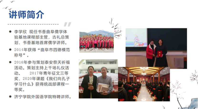 2022年11月29日晚,为深入推进《孔孟之乡地域文化翻译课程》内涵改革,用外语讲好中国传统文化故事,安博站官网登录入口邀请书香曲阜儒学体验基地首席儒学讲师李学欣做了题为《儒之商——中国商人的“儒”》的国学讲座。讲座由安博站官网登录入口教师颜冬梅主持,120余名外院师生聆听了本次讲座。