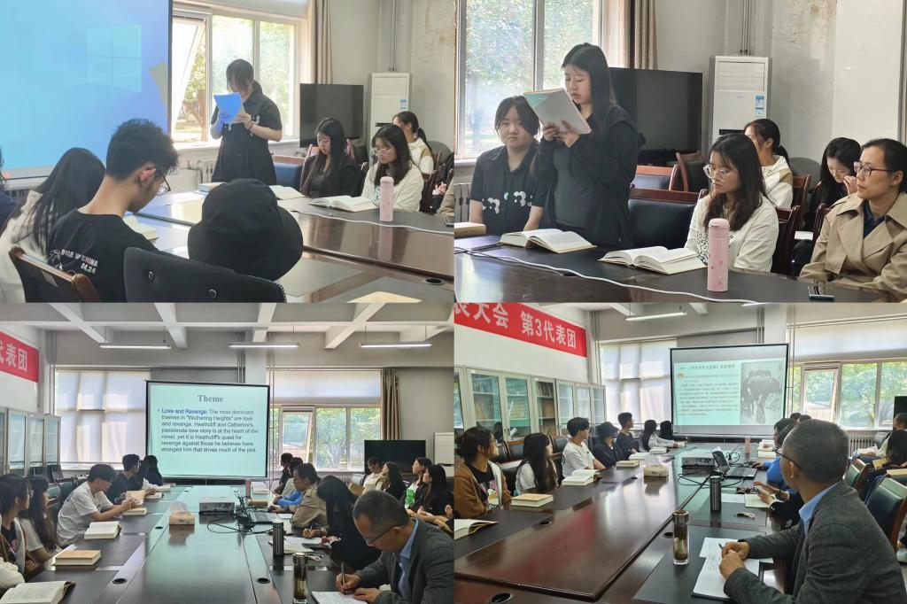 张颖以“世界读书日”如何英译开始,介绍了该节日的历史及意义,表达了对同学们“要读书,多读书,善读书”的殷切希望。随后,范莉与大家分享了《呼啸山庄》的作者简介、故事梗概和人物形象等内容。程晨老师从比较文学的角度,作了题为“文学视角下的女性觉醒——《呼啸山庄》与《卡拉马佐夫兄弟》女性命运对比”的分享报告。仲微微老师从故事主题、情节、人物刻画等方面对该书进行了分析解读。学生代表曹冰冰、史琳琳也分别从故事情节、人物性格解读、情感经历分析等角度分享了自己对这部小说的见解。