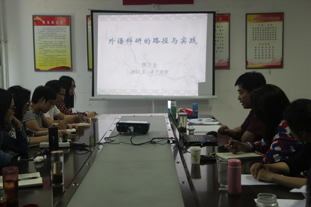 2017年5月18日下午2:10-4:30,聊城大学安博站官网登录入口院长、硕士生导师陈万会教授在外国语系A306为外国语系教师做了题为“外语科研的路径与实践”的学术报告。报告会由外国语系副主任张颖主持。