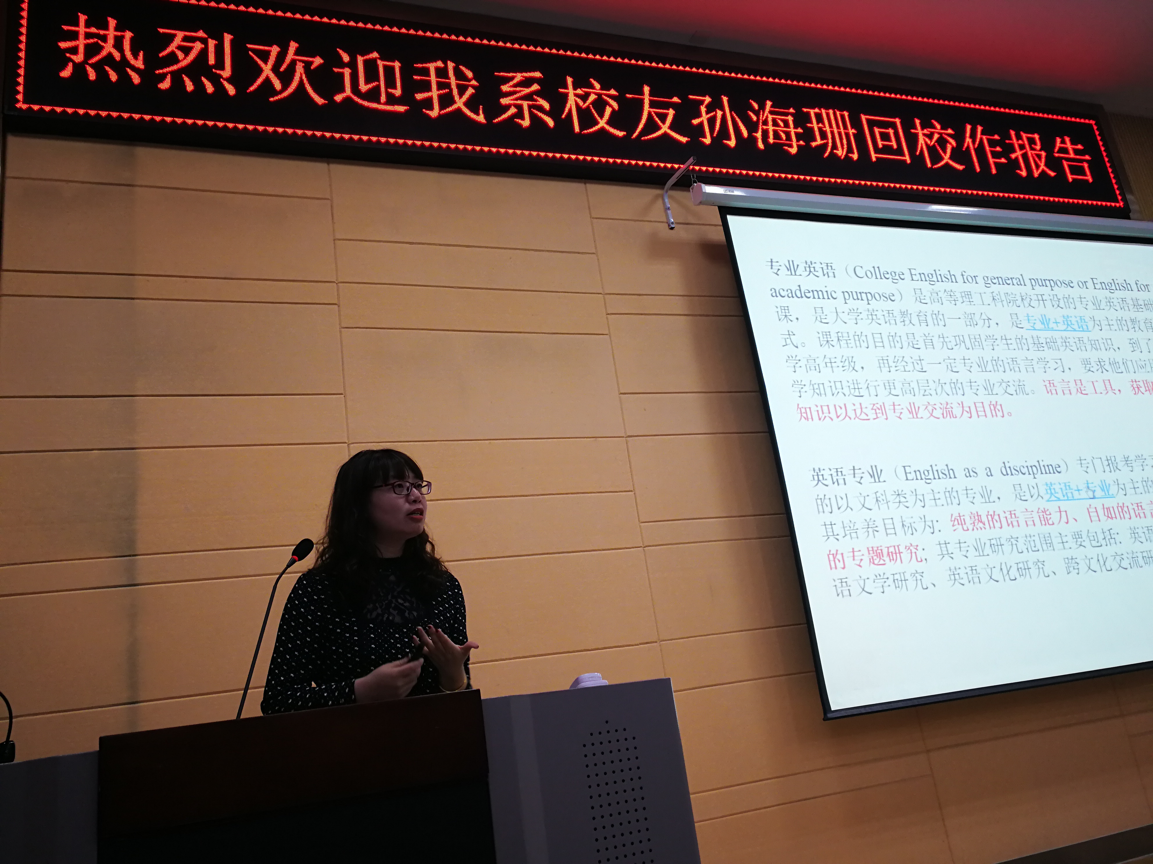 孙海珊老师是我校2001届外语系毕业生,在报告伊始,她首先给大家分享了一张自己大学时代的集体照片,表达了对母校和母校老师的尊敬和热爱,也把会场带入了一片温馨的氛围之中。接下来,孙老师结合自己丰富的教学经历和参加、指导演讲比赛的经验,围绕英语语言综合运用能力的培养这一主题进行了阐述。她指出,作为英语专业的学生,一定要有正确的学习动机,通过深入学习培养对英语语言本身的兴趣是学习英语的最高境界。其次,由于英语专业面临着各种严峻的挑战,在这种形势下,要更加重视综合语言运用能力的提高。紧接着报告从文化意识、情感态度和学习策略三个方面展开了更为详细的论述,孙海珊老师通过生动的举例,激情洋溢的表达和互动环节的设置大大激发了在场学生的兴趣和热情,会场气氛活跃。