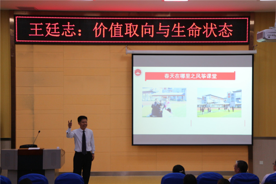 在报告中,王廷志校长结合自己的人生经历从办学理念、人生感悟和人生策略三个方面进行了阐述。首先王校长以东方学校办学的六字箴言“民族根、国际范”为引,讲述了自己的事业历程。他指出,正确的价值取向决定思维方式,从而决定生命的状态;一个人在社会上要“靠精神站立,靠专业行走”,因此,必须加强个人能力的磨炼和提升。接下来王校长通过十二个关键词跟大家分享了自己的人生感悟,即善始、乐之、庄肃、善学、善思、规划、慎独、利他、勤奋、忠恕、有恒,并提出了“三箭齐发”的人生策略,即激情、专业和自我管理。