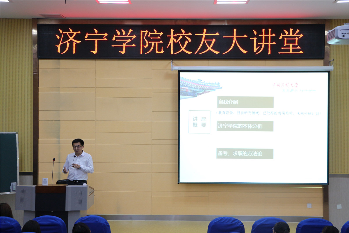 报告会伊始,由我系党总支书记陈彦华为焦学振博士颁赠了“校友大讲堂”的纪念铭牌。在报告会上,焦学振博士首先向大家简单介绍了一下自己的求学经历以及所获得的科研学术成果,由专科起点到专升本、本升研再到研升博的这样一个过程告诉大家不要妄自菲薄,只要坚持梦想不放弃,不论起点高低,都有机会登上知识的高峰,领略更加壮丽的风景。而后,焦博士做了一个关于人文环境的本体分析,从而提醒大家任何时候都要对自己所处的环境有一个清醒的认识,通过分析其优势和劣势,做好规划,扬长避短,朝着初心所向,矢志不移。最后是焦博士特别为外语系学弟学妹们准备的一点“干货”,即结合自己的经历总结的一些备考和求职战略,包括了择校、备考、心态调整、跨专业学科的选择以及方法论等很多贴心的细节。在报告的尾声,焦学振博士以自己导师的一首诗“绿荷吟”相赠,让整个会场平添了一股诗意的氛围。伴随着阵阵荷香和掌声,报告会圆满结束。