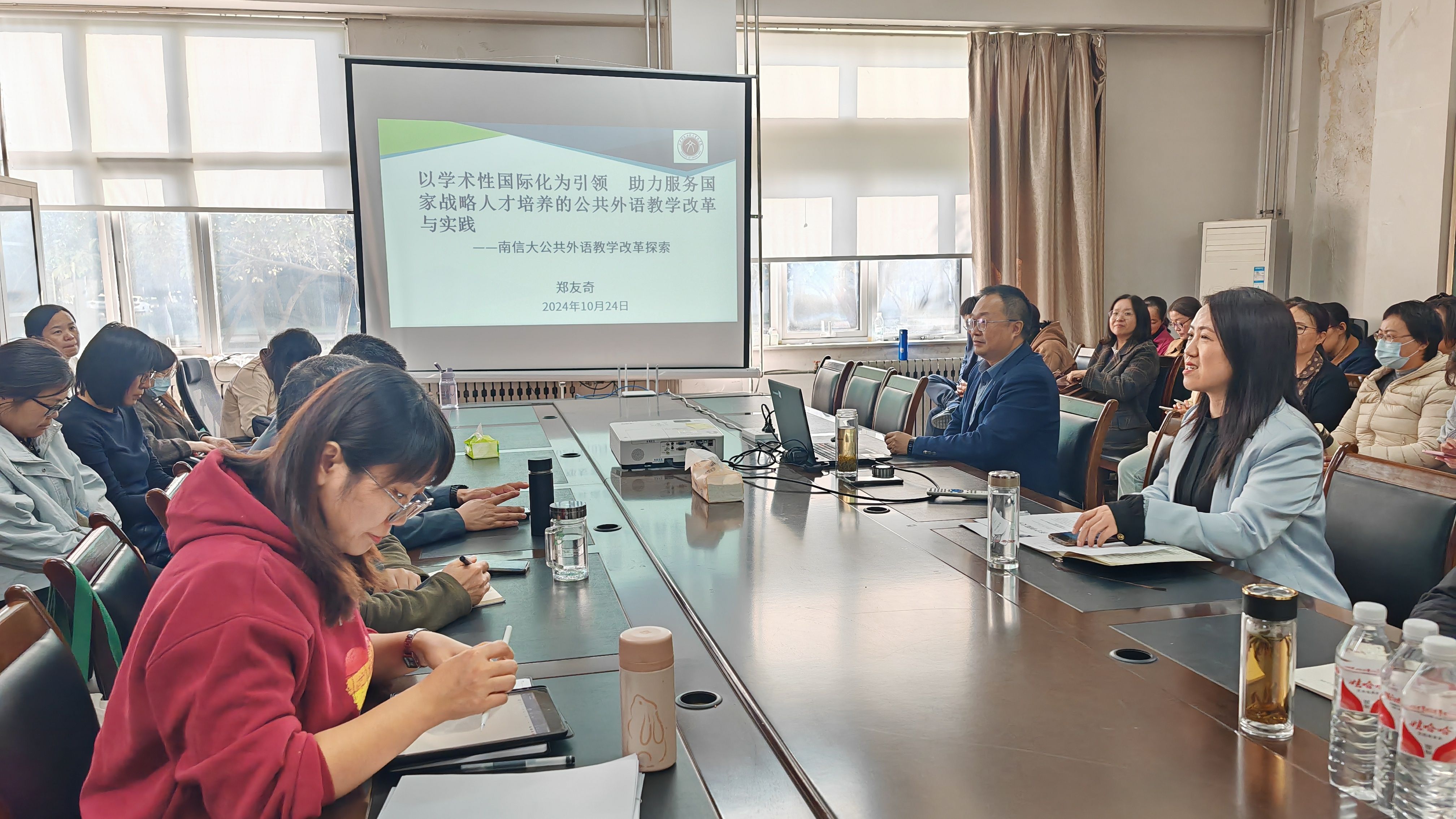 为进一步深化教学改革,10月24日下午,安博站官网登录入口在3号楼A110室举办教师发展沙龙第十三期活动暨教学改革探索与实践培训会,邀请南京信息工程大学文学院副院长郑友奇教授作题为“以学术性国际化为引领助力服务国家战略人才培养的公共外语教学改革与实践”的学术报告,教务处教学管理科科长李忠豪,学院副院长张颖,学术副院长闫彩霞、范莉及全体专任教师参加,本次活动由张颖主持。