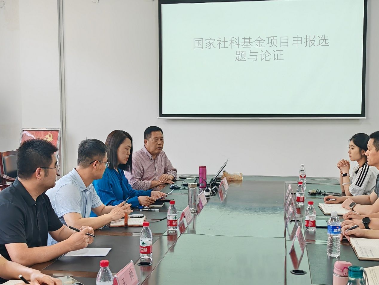 会上,潘教授从国社基金类别、国社基金一般项目、申报后期资助介绍和匿名评审情况等四个方面对国家社科基金项目的申报选题与论证进行了详细阐述。潘教授指出,首先,定一个新颖的选题是国社科基金项目申报成功的关键;其次,对前人研究存在的问题的提炼,决定了申报书的质量;再次,研究对象、研究问题和主要观点要清晰明确;最后,所有理论或视角与研究对象要有直接的因果相关性。上述观点的提出对与会教师从选题、文献综述的梳理和理论框架的拟定提供了方向和思路。此外,潘教授对国际期刊的写作与发表提出了建设性观点,极大拓展了与会教师的国际视野。