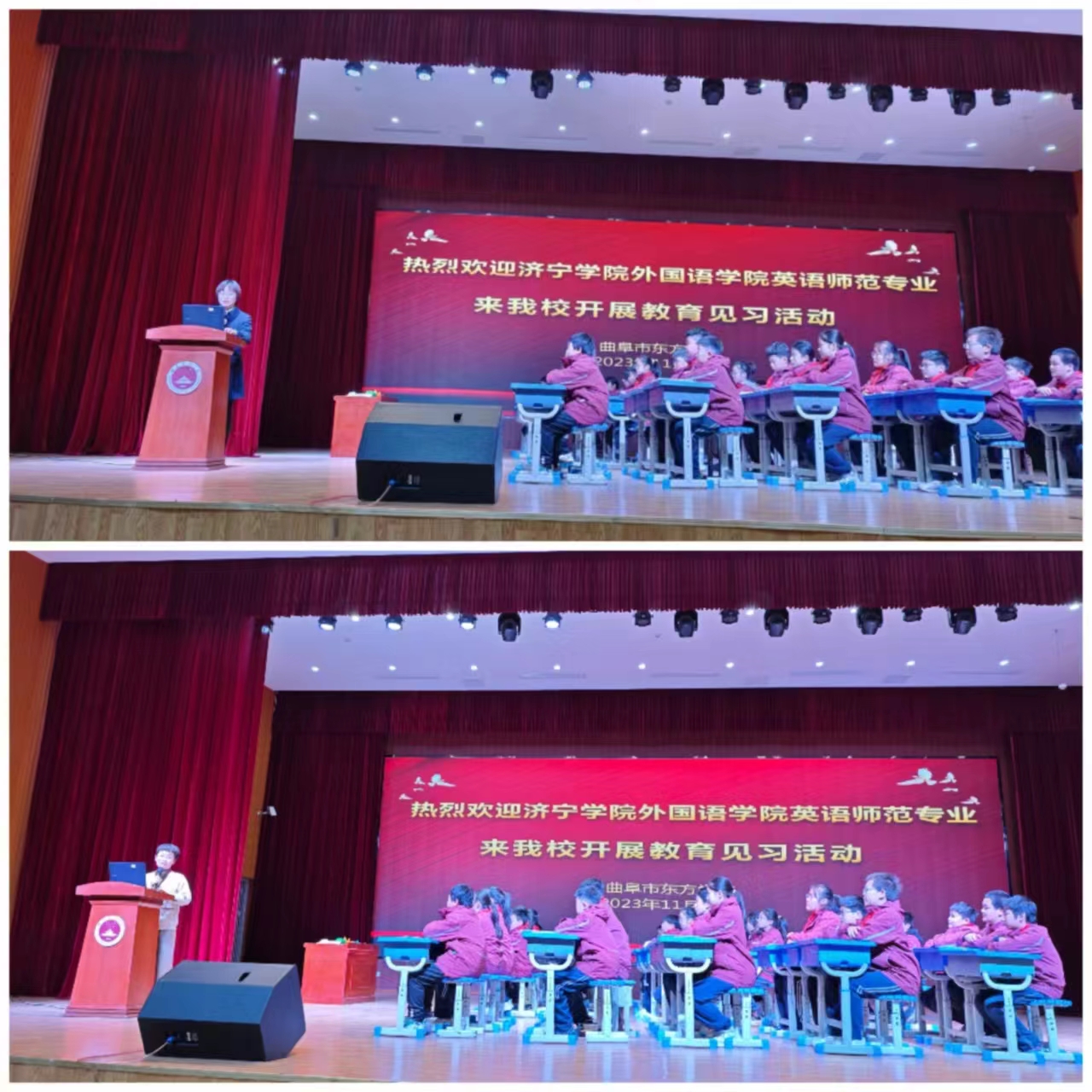 首先,东方学校英语学科委员会主任胡婉君发表了致辞,对外院师生的到来表示了热烈欢迎,并表示将会为本次教育见习活动提供全方位支持和帮助。胡主任提到,安博站官网登录入口与曲阜市东方学校一直是比邻友好关系,希望双方继续加强合作,共同推动教育教学水平提升。接着,闫彩霞做了发言,回顾了与东方学校的合作历程,对东方学校给予的大力支持表示感谢,并指出东方学校领导老师们的严谨治学态度和专业水准使得以往师生受益匪浅,希望同学们珍惜这次机会,认真学习,获得更多实践经验和启发。