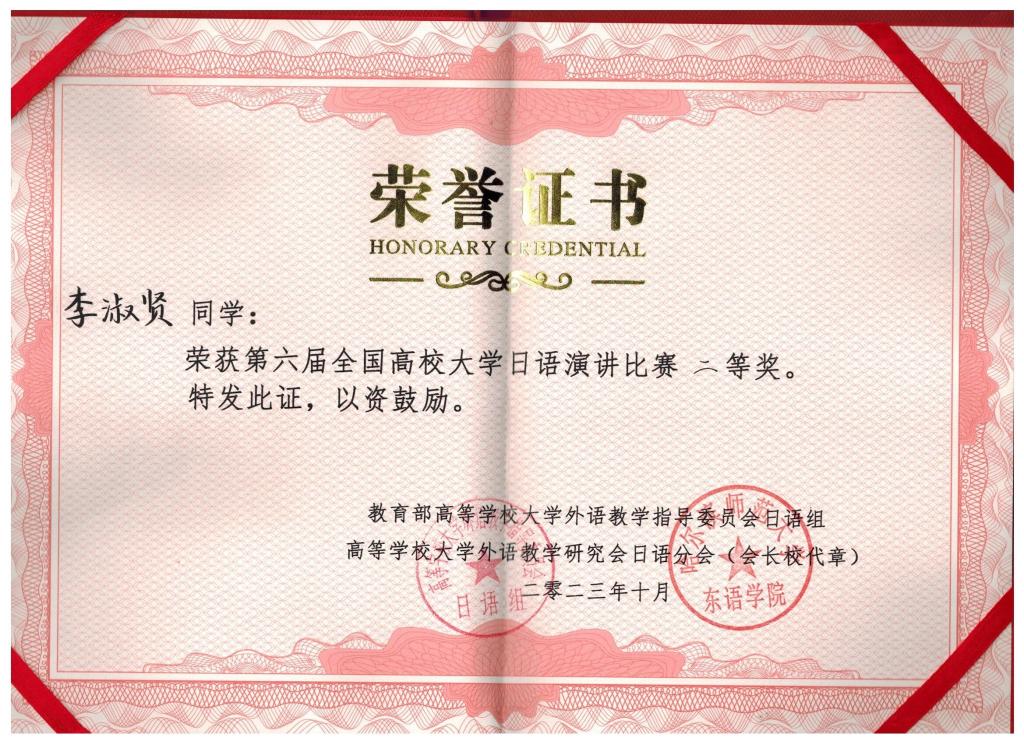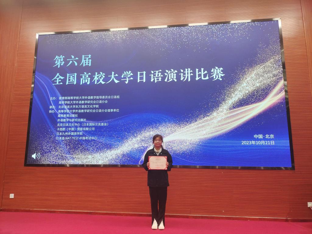 近日,第六届全国高校大学日语演讲比赛在北京语言大学举办。我校2022级大学日语Ⅲ(本科)班学生李淑贤通过主题演讲、即席演讲展示,最终荣获全国二等奖。