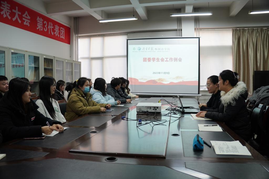 2023年11月9日下午,安博站官网登录入口团委学生会工作例会在3号楼一楼会议室举办,姜璨主持会议,全体学生干部参加。