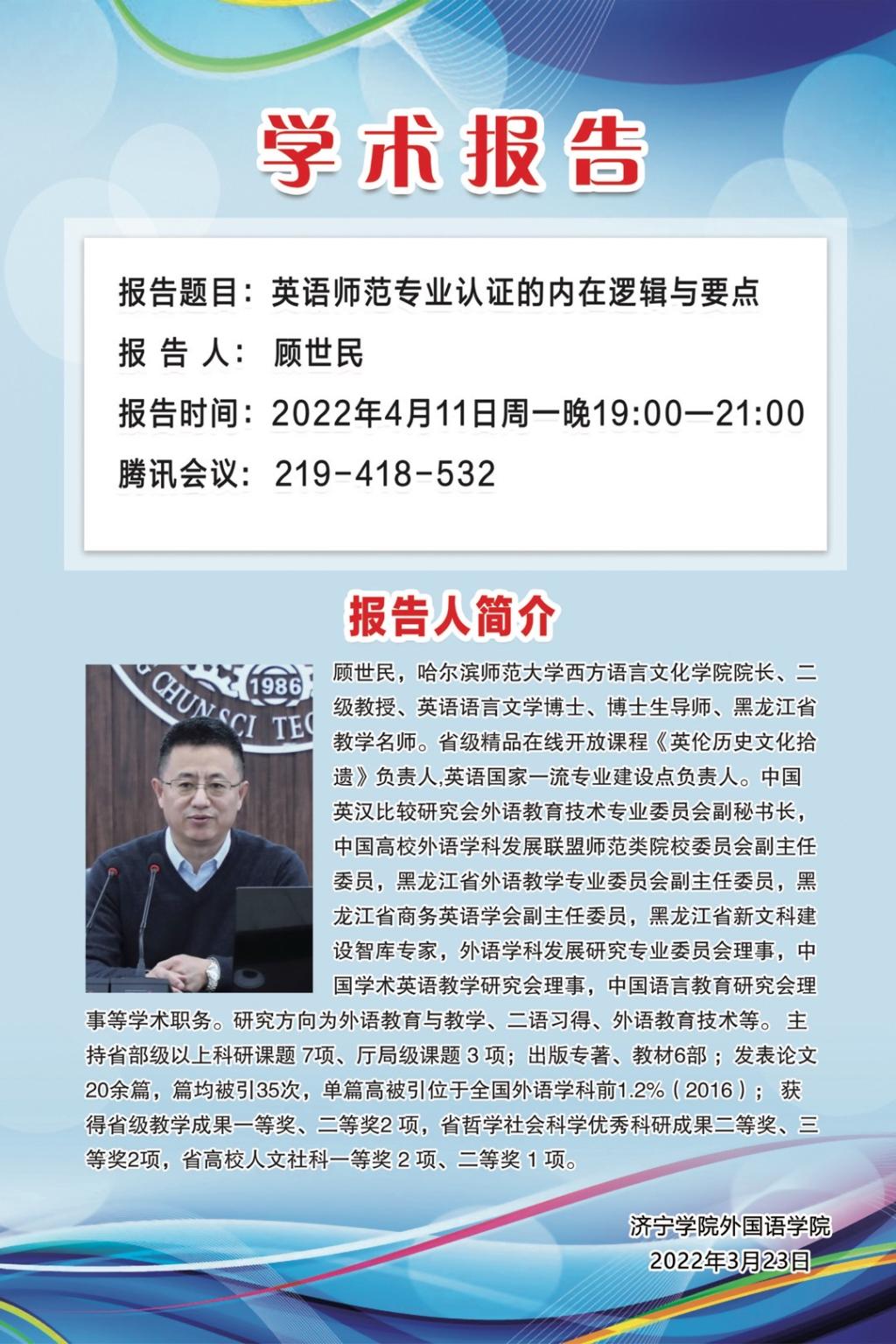 4月11日晚,哈尔滨师范大学顾世民教授应邀为安博站官网登录入口全体教师做了题为“英语师范专业认证的内在逻辑与要点”的线上讲座。本次讲座由安博站官网登录入口院长杨楠教授主持,外院全体老师通过腾讯会议参加了讲座。