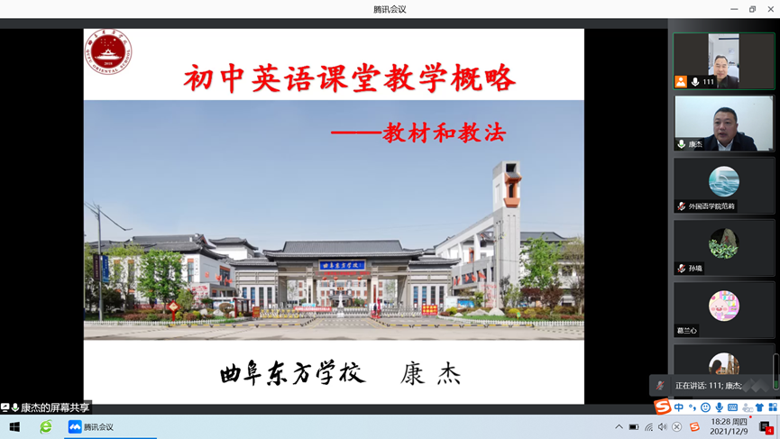 为进一步提高师范生教育教学技能,促进理论教学与实践教学的有机融合,2021129日晚,我院名师进课堂活动邀请到了曲阜东方学校副校长康杰为外院师生做了题为初中英语课堂教学概略---教材和教法的讲座。因疫情缘故,本次讲座通过腾讯会议采取了线上课堂的形式。讲座由我院英语专业师范方向负责人吴瑞民主持,英语师范生教师教育导师团,2019级公费师范生和2021级英语专升本(师范方向)学生,共计150余人聆听了本次讲座。